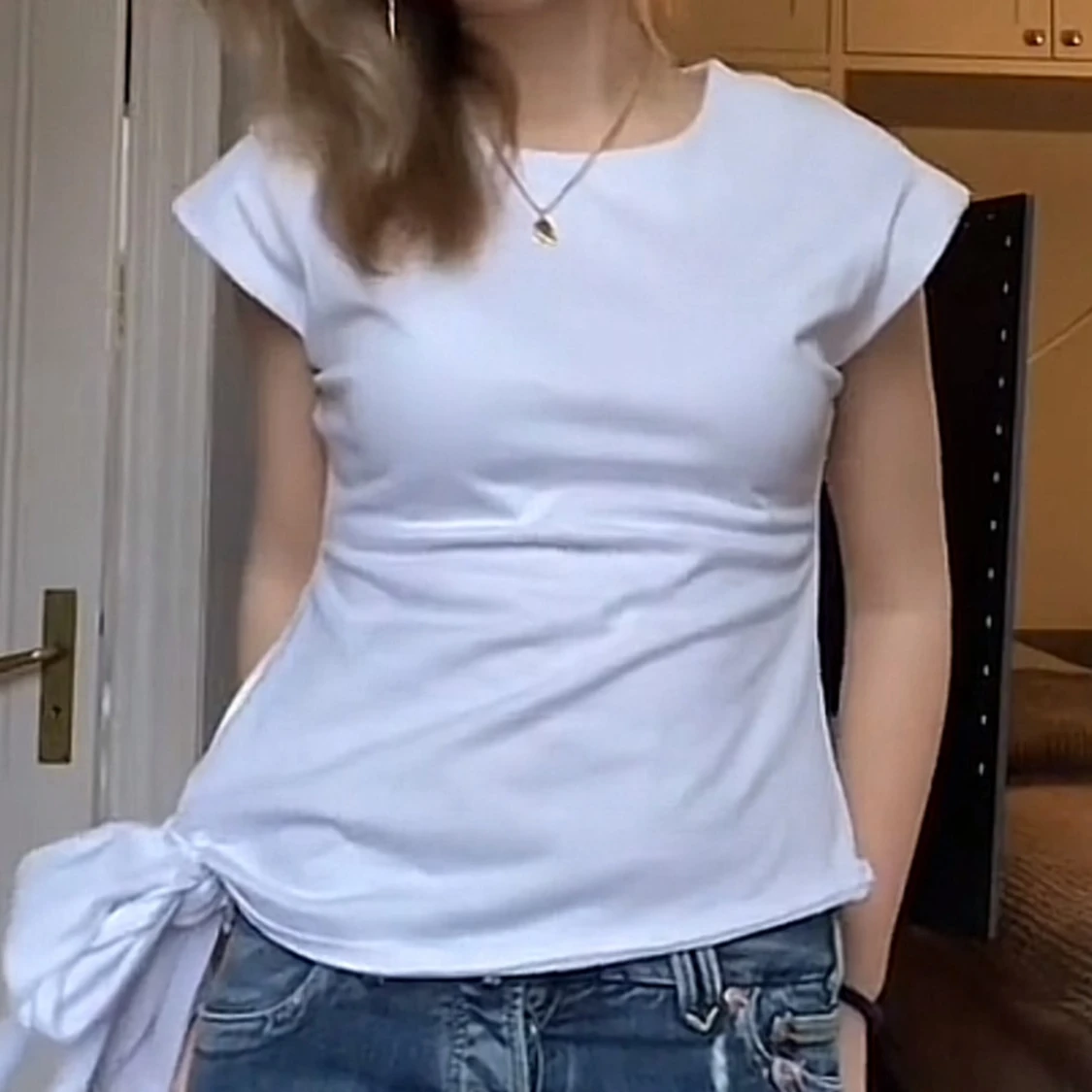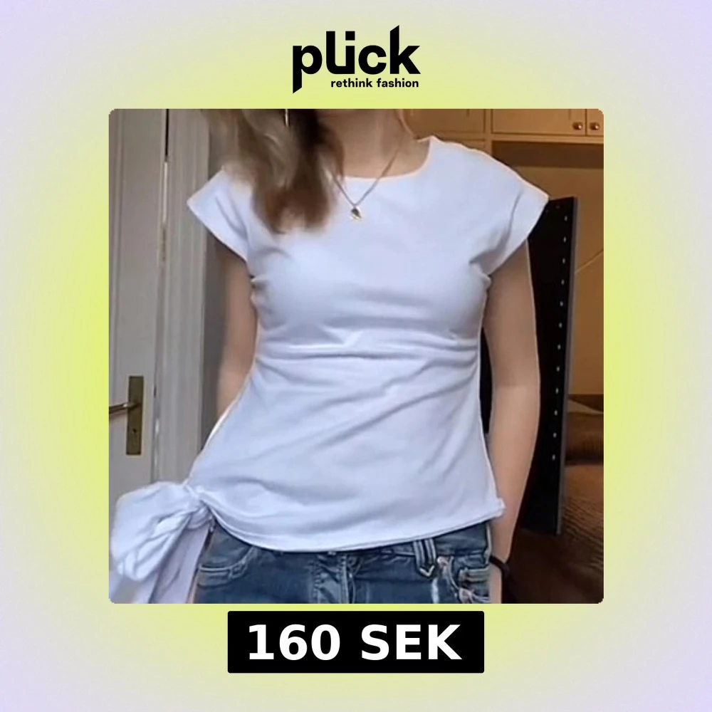 Säljer en vit topp med korta ärmar och rund halsringning. Toppen har en snygg knytdetalj i sidan som ger en cool och trendig look. Perfekt att matcha med jeans eller kjol för en avslappnad stil.
