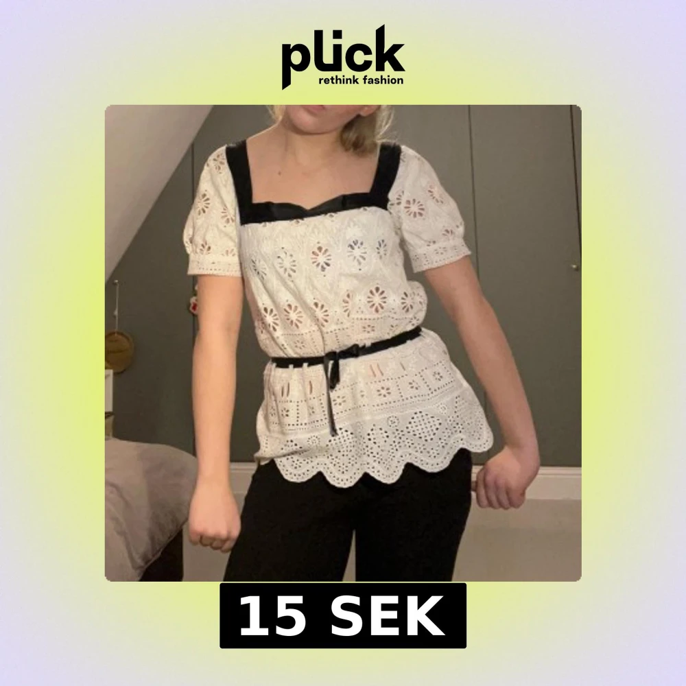 Superfin vit blus, broderad och med svarta detaljer vid halsringning och midja. Blusen har korta puffärmar, knytband i midjan och vågig nederkant. Perfekt för en söt och trendig look!