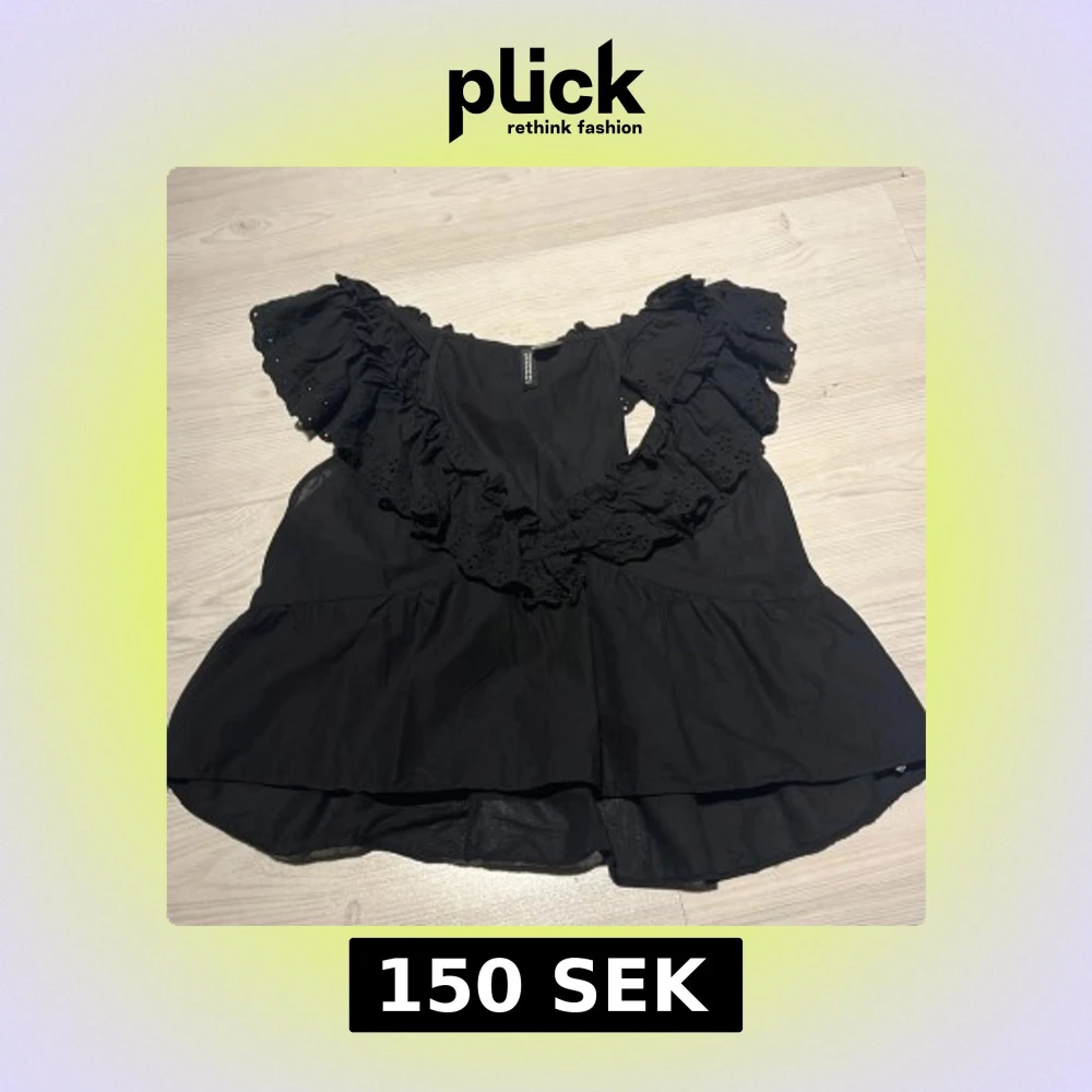 Snygg svart blus med volangdetaljer runt halsen och ärmarna. Tröjan har inga defekter och är använd 1 gång.