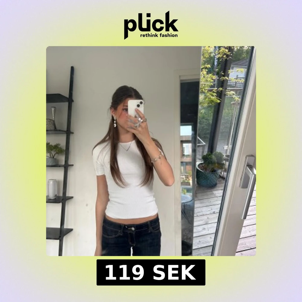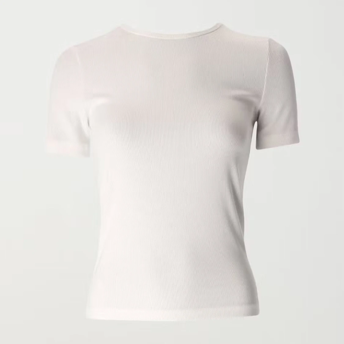 Säljer en enkel och basic vit ribbad t-shirt med korta ärmar och rund halsringning från Gina. Perfekt basplagg som passar till det mesta och har en tight passform.