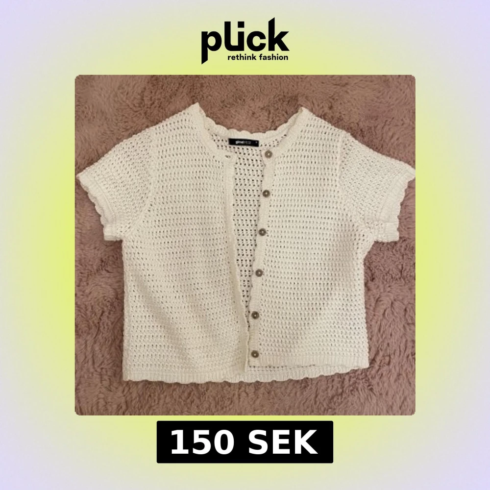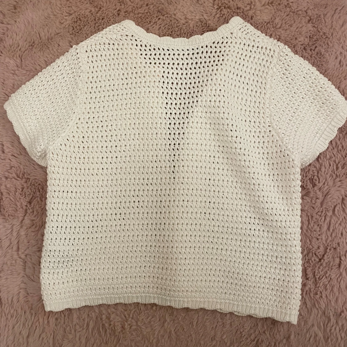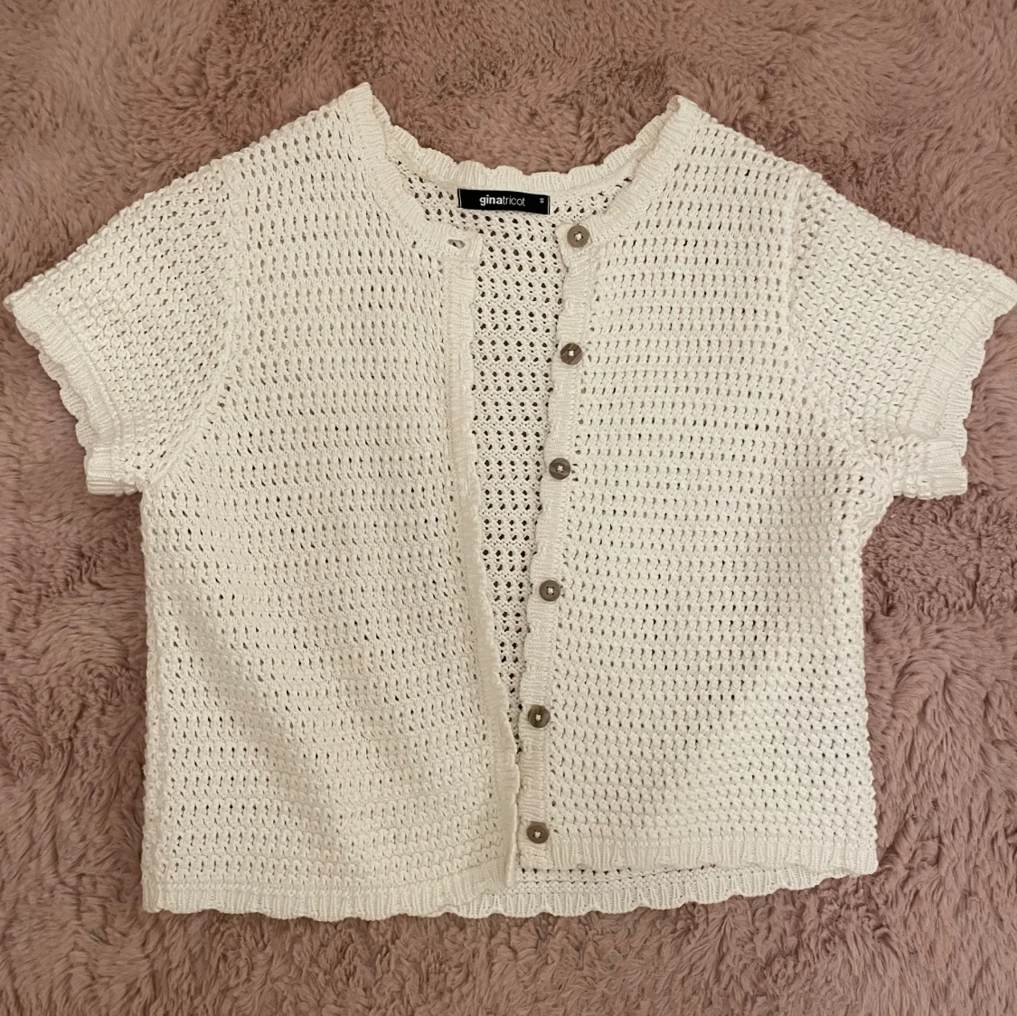 Säljer en söt vit stickad blus från Gina Tricot med korta ärmar och knappar framtill. Blusen har en luftig, virkad känsla och vågig kant vid hals och ärmslut. Perfekt för en fräsch och somrig look.