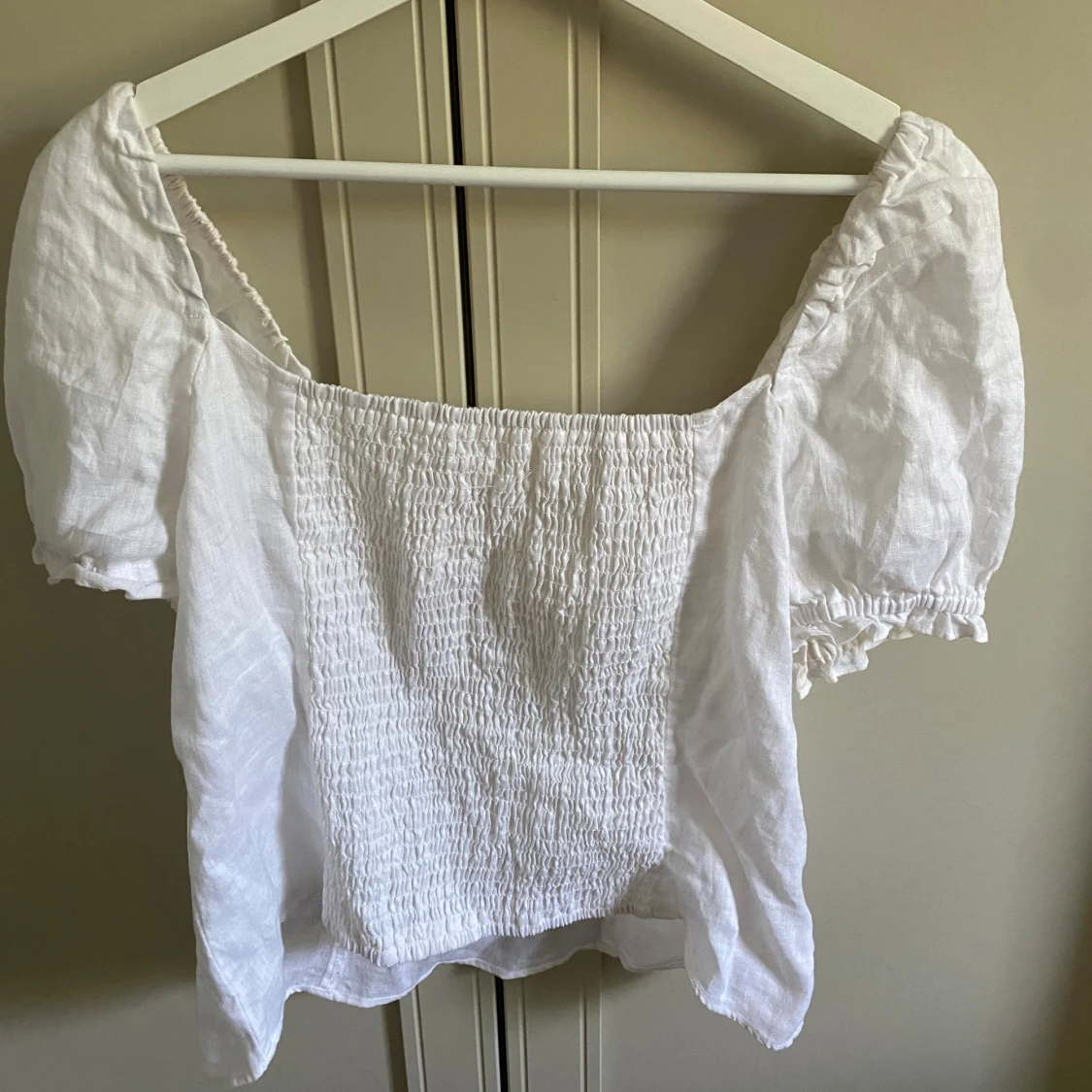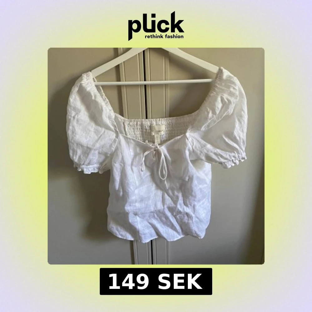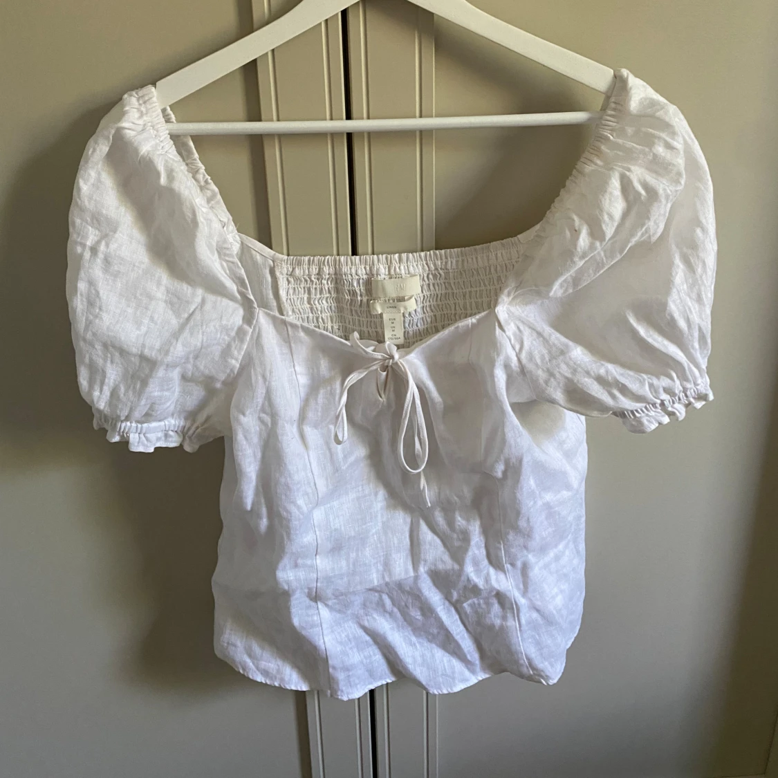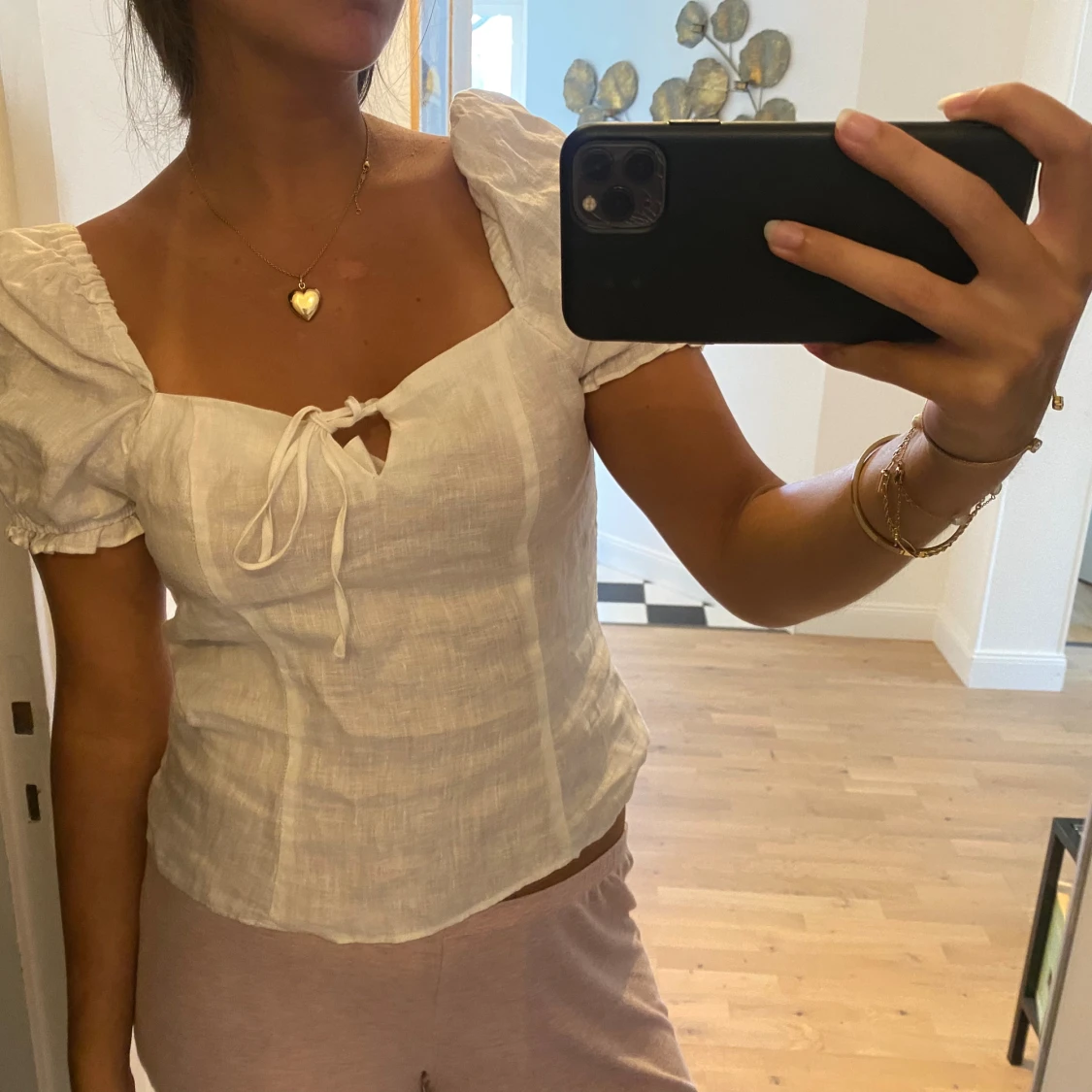 Superfin vit linnetopp från H&M med puffiga korta ärmar och smockad rygg. Toppen har en söt knytning framtill och lätt croppad passform. Perfekt för sommarens alla dagar, med luftig känsla och romantisk stil.