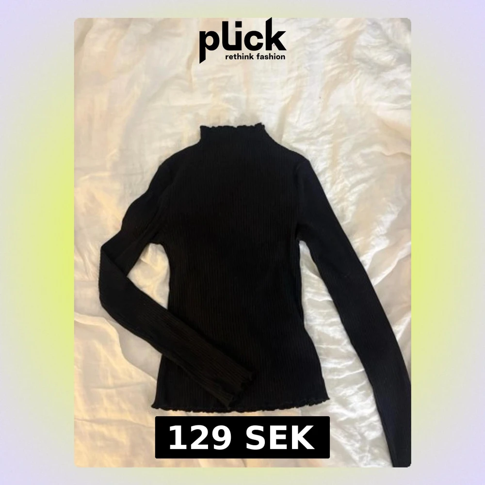 Svart ribbad polotopp från H&M med lång ärm och hög hals. Toppen har en tight passform och vågiga kanter vid hals och nederkant. Perfekt att styla med jeans eller kjol för en clean look.