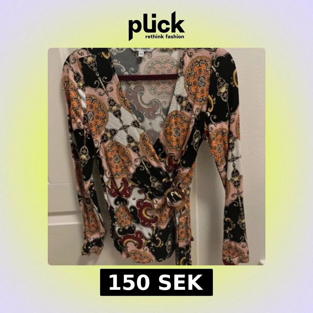 Säljer en färgglad omlottopp från KappAhl med ett unikt mönster i orange, svart, rosa och vitt. Toppen har långa ärmar och en dekorativ ringdetalj vid midjan. Perfekt för att liva upp garderoben!