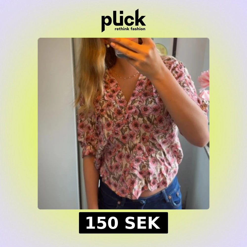 Säljer en söt blommig blus med v-ringning och korta ärmar. Blusen har ett mönster med rosa blommor och gröna detaljer på beige botten. Den är lite croppad och har en luftig passform, perfekt för varma dagar. Materialet känns lätt och skönt mot huden. Hoppas denna kommer till användning hos någon annan!!💕💕💕