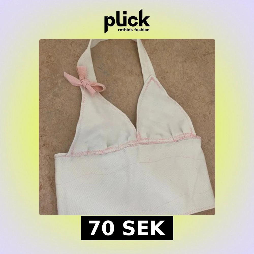 Egensydd supersöt jeans halterneck med svarta knappar i ryggen. Ljusrosa sömmaar samt en ljusrosa roset på ena axelbandet.