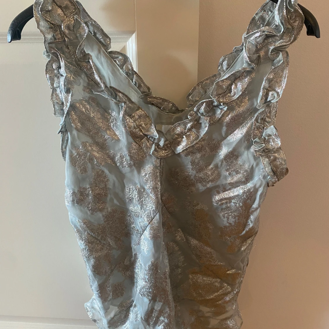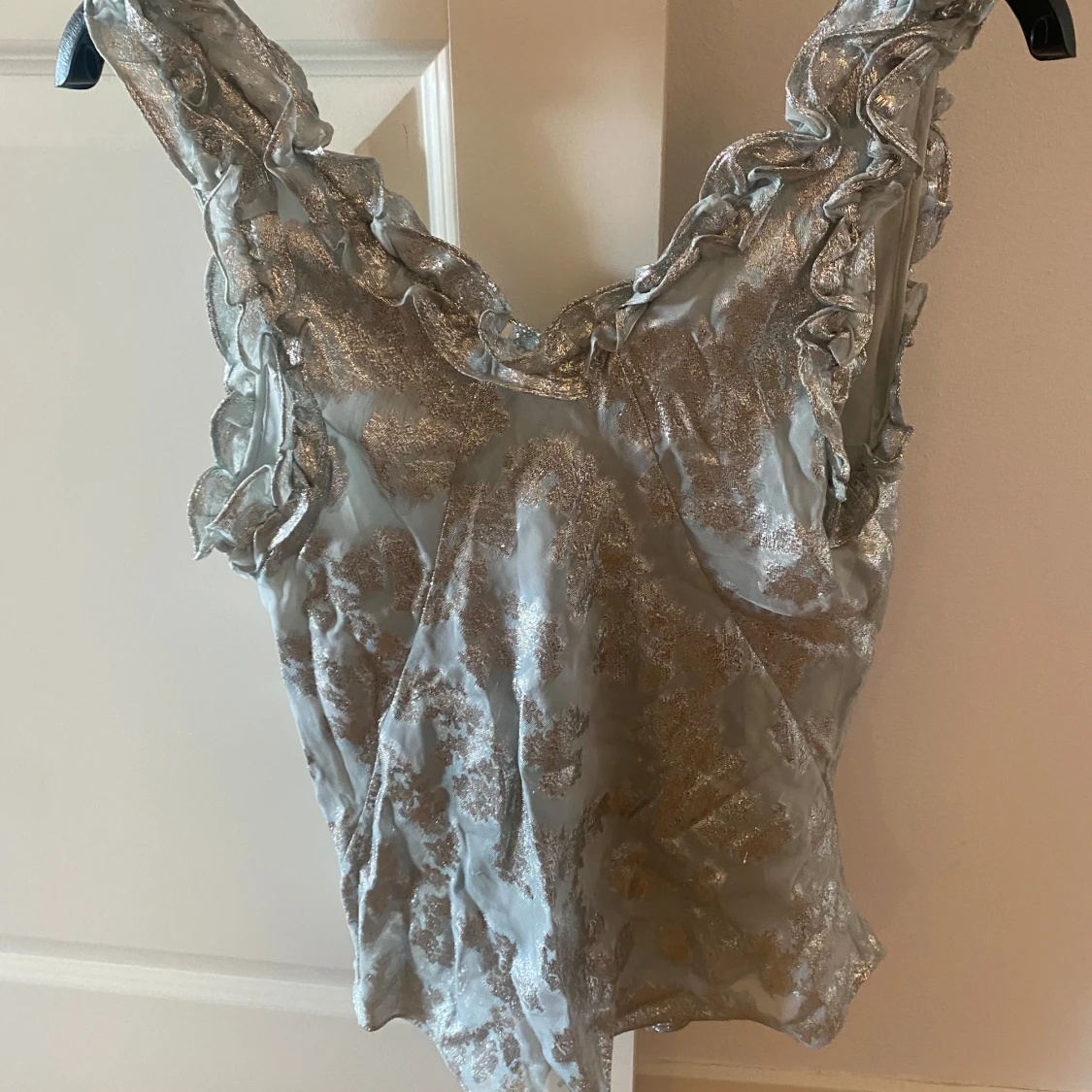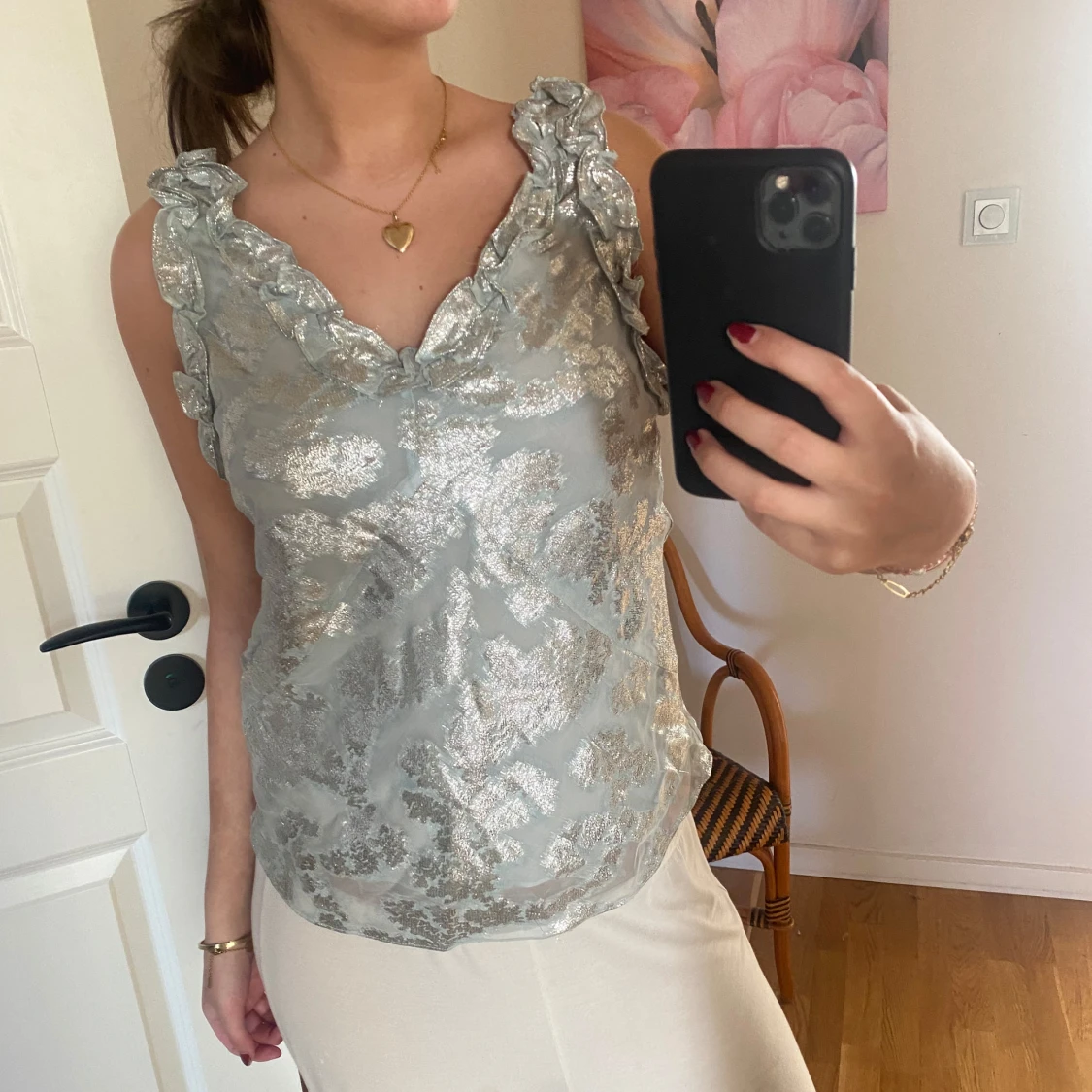 Snygg ärmlös topp i silverglittrigt material med volangdetaljer längs axlarna. Perfekt för att ge en extra touch av glamour till din outfit. Toppen har en v-ringad design och är tillverkad i ett lätt och luftigt material.