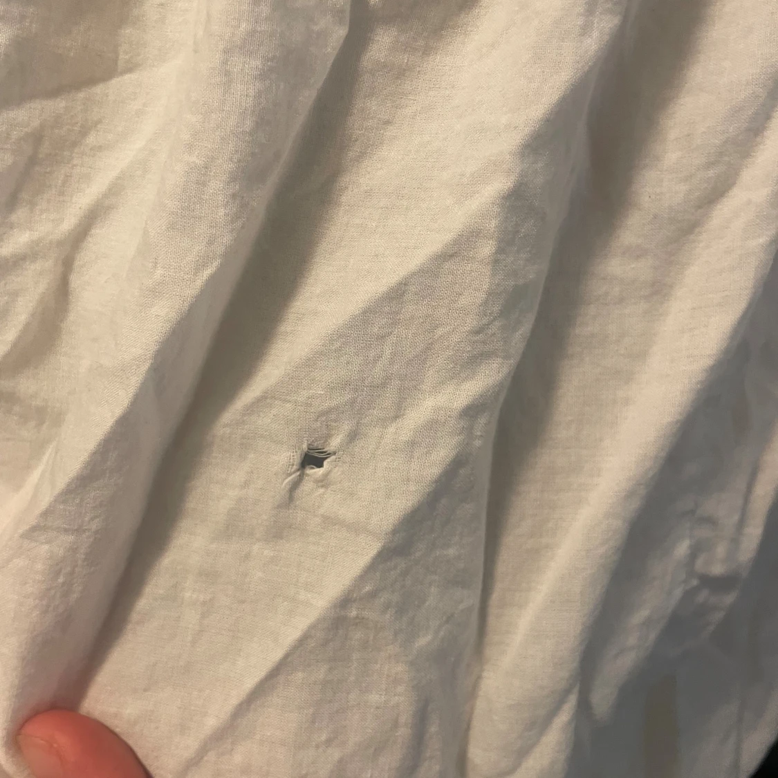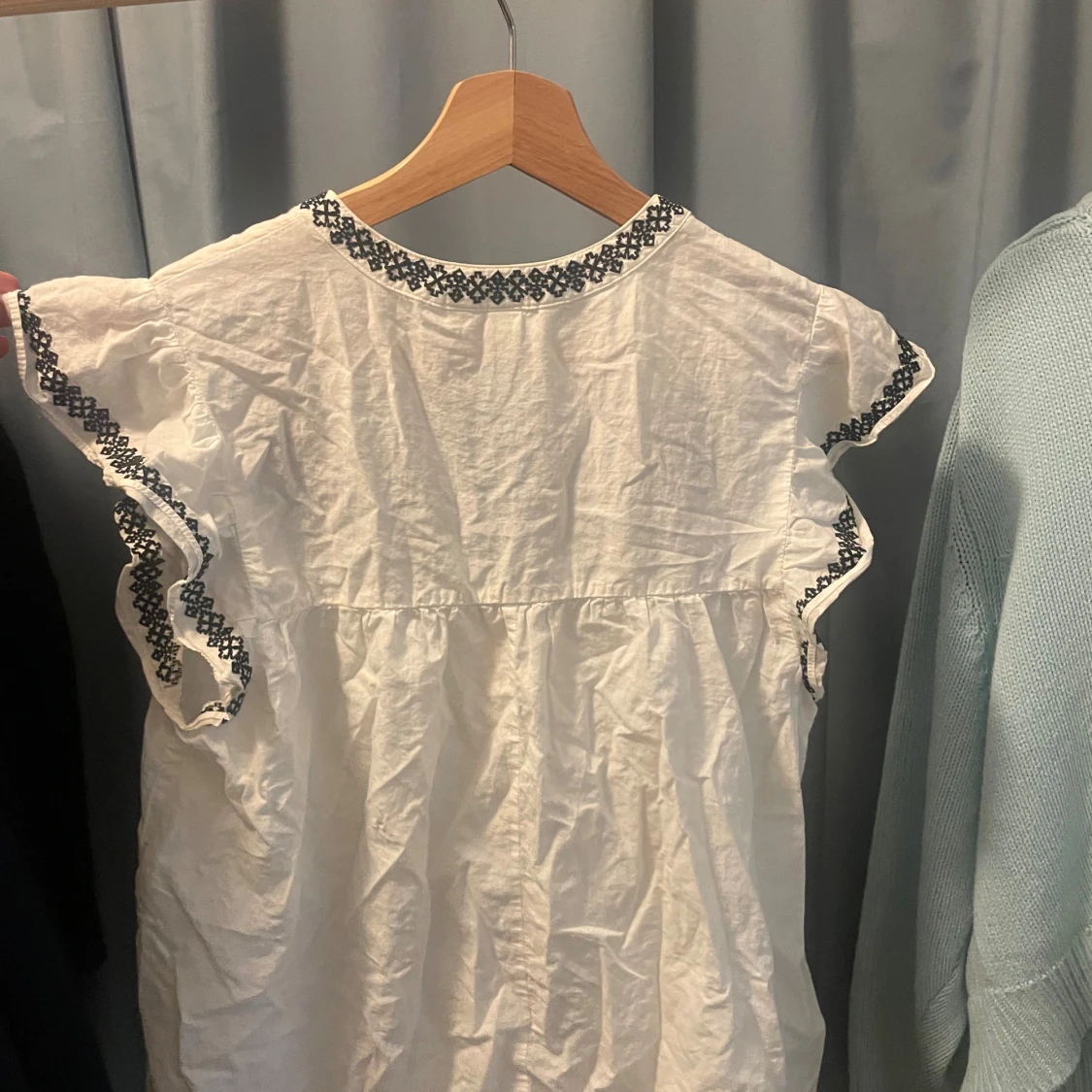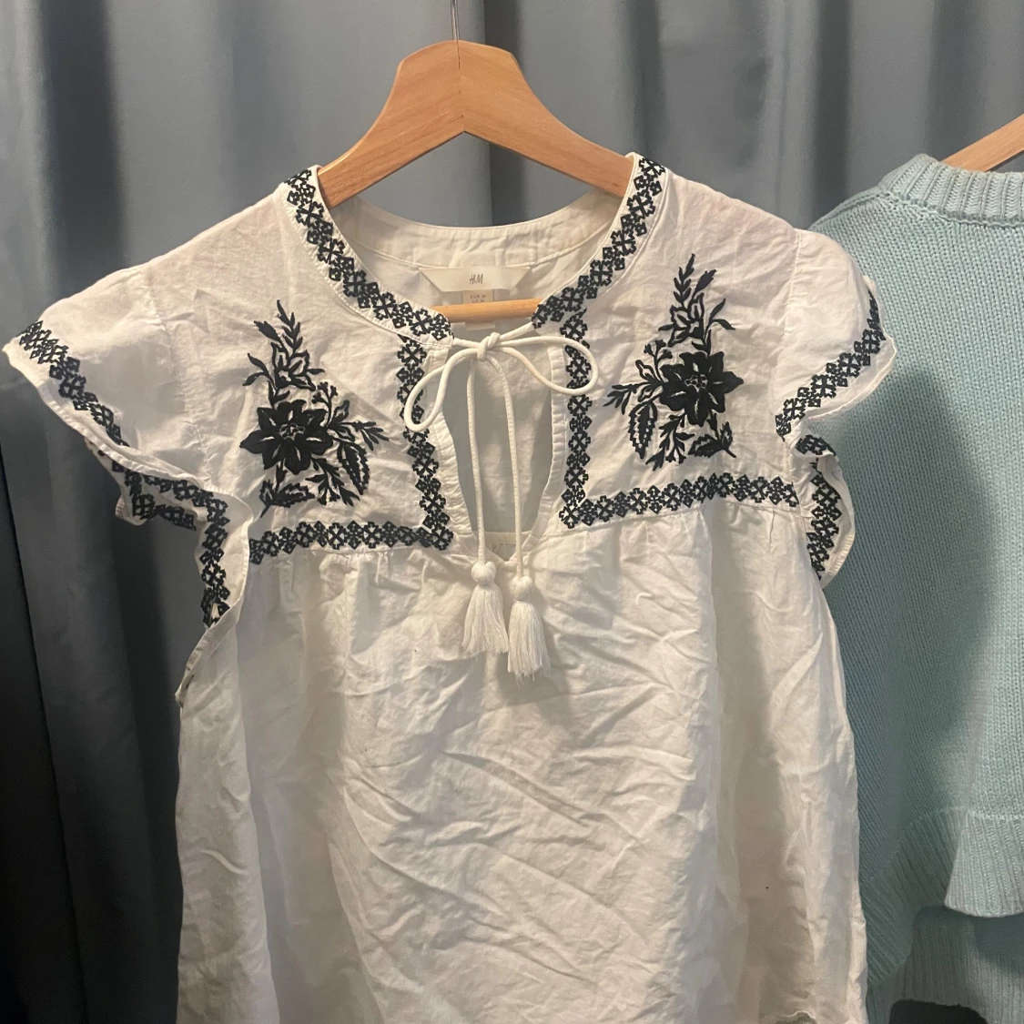 Vit blus från H&M med svarta broderade blommor och dekorativa band med tofsar vid halsen. Blusen har korta volangärmar och är tillverkad i bomull. Perfekt för en bohemisk look med snygga detaljer och luftig passform. Den har ett litet hål på ryggen som knappt syns men annars jätte söt🩵🩷💖✨🫰🏻