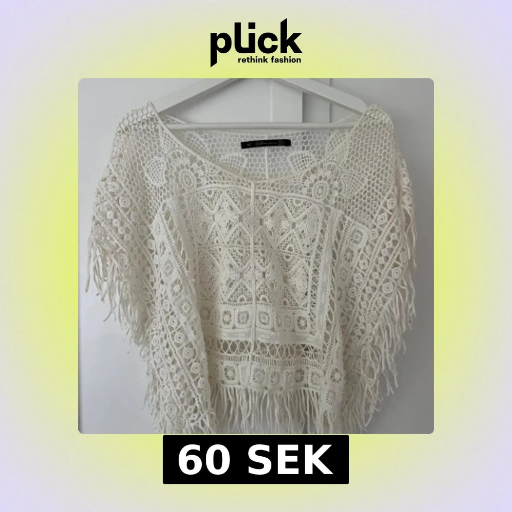 Superfin vit virkad blus från Zara Trafaluc med snygga virkade mönster och fransar längs nederkanten och ärmarna. Blusen har en lös passform och är perfekt för sommarens alla tillfällen. Materialet är bomull och den har korta ärmar.