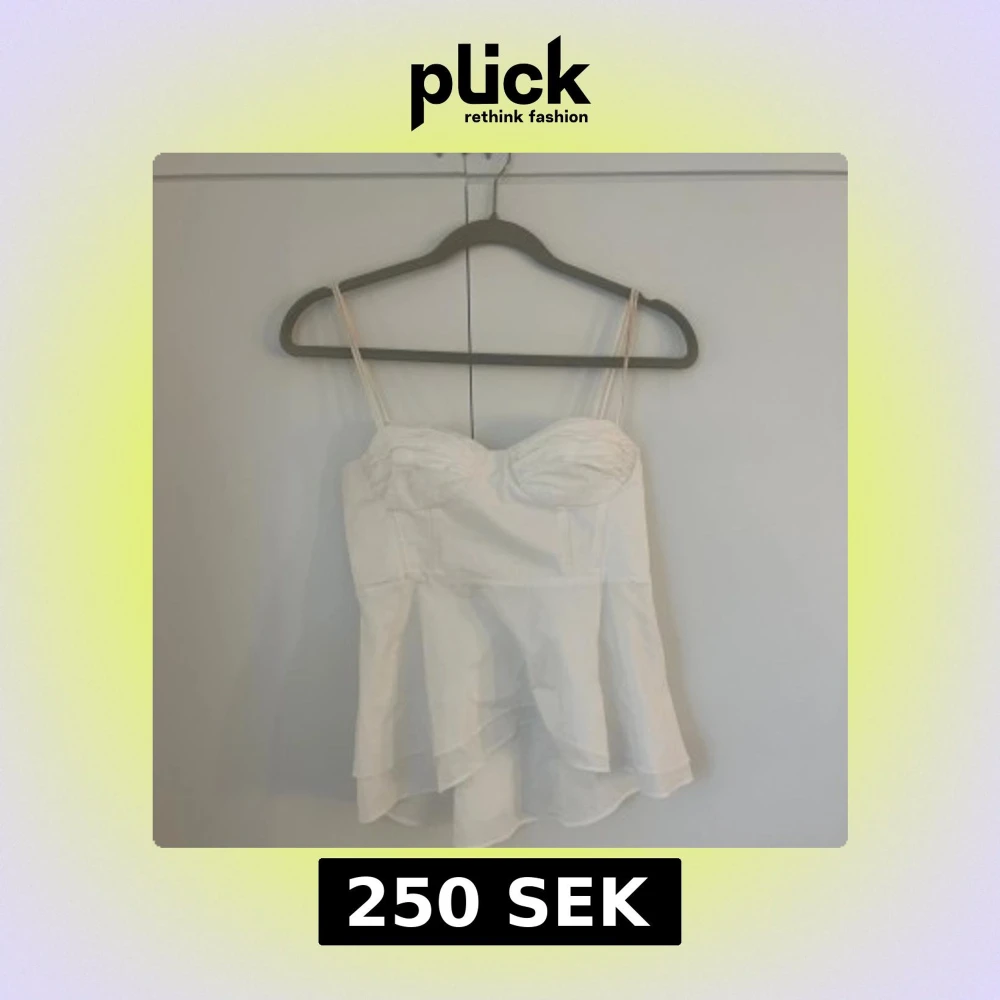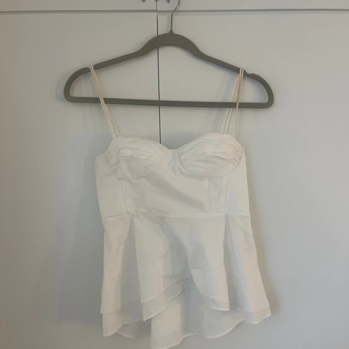 Säljer en söt vit linnetopp med tunna axelband och volang nertill. Toppen har markerade kupor och en lätt utsvängd passform som ger en romantisk vibe. Perfekt för varma dagar eller när du vill känna dig extra fin.