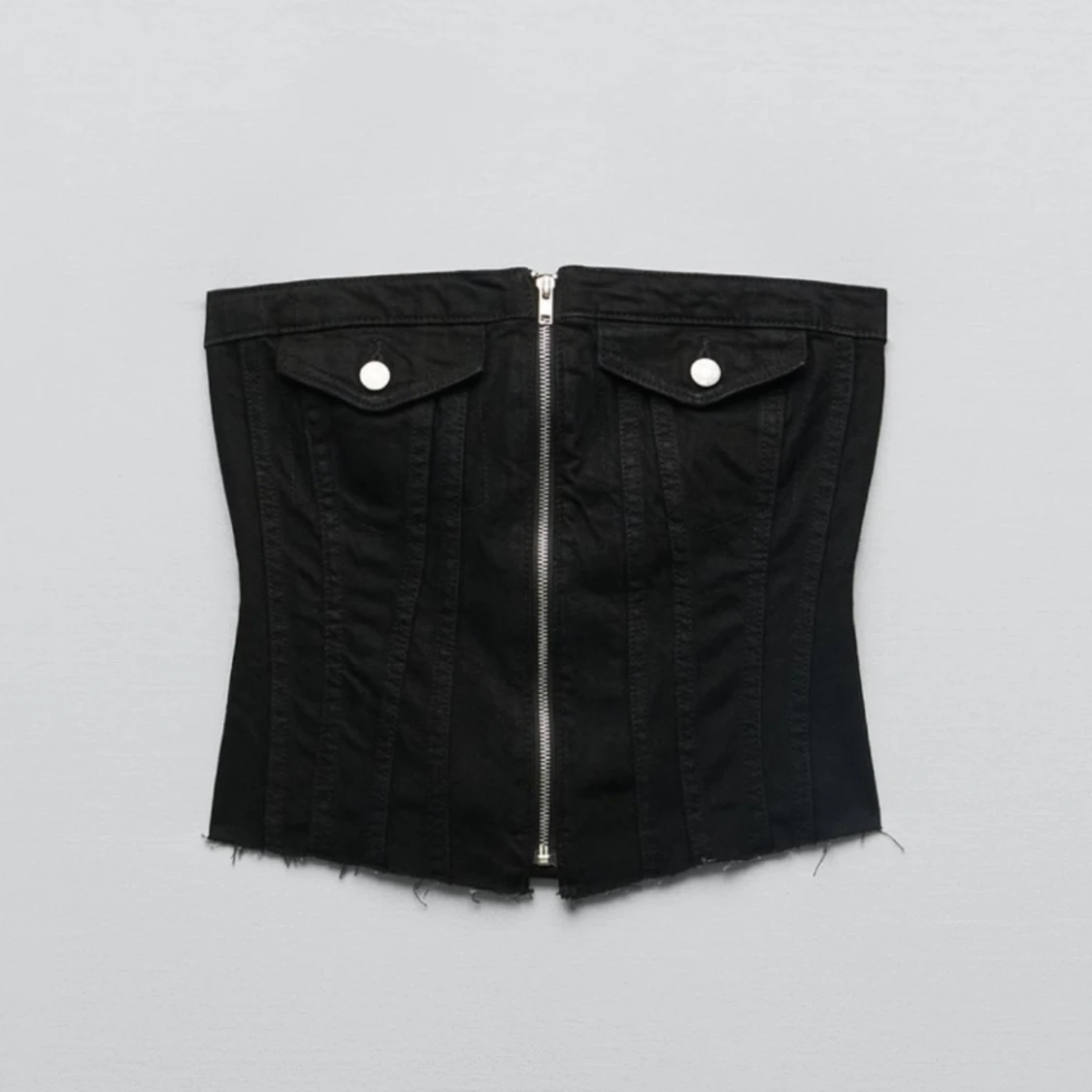 Säljer den här slutsålda denim korsetten från Zara då den blivit för liten. Skulle säga att den passar en 34/36 beroende på bysten då den satt lite tajt på mig. 200kr+ frakt.