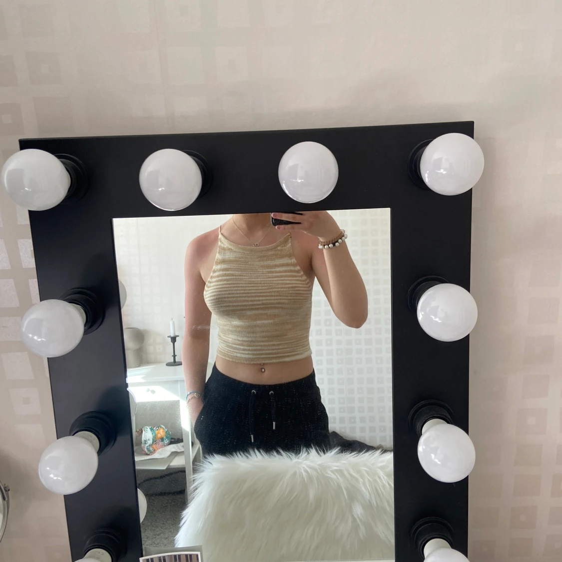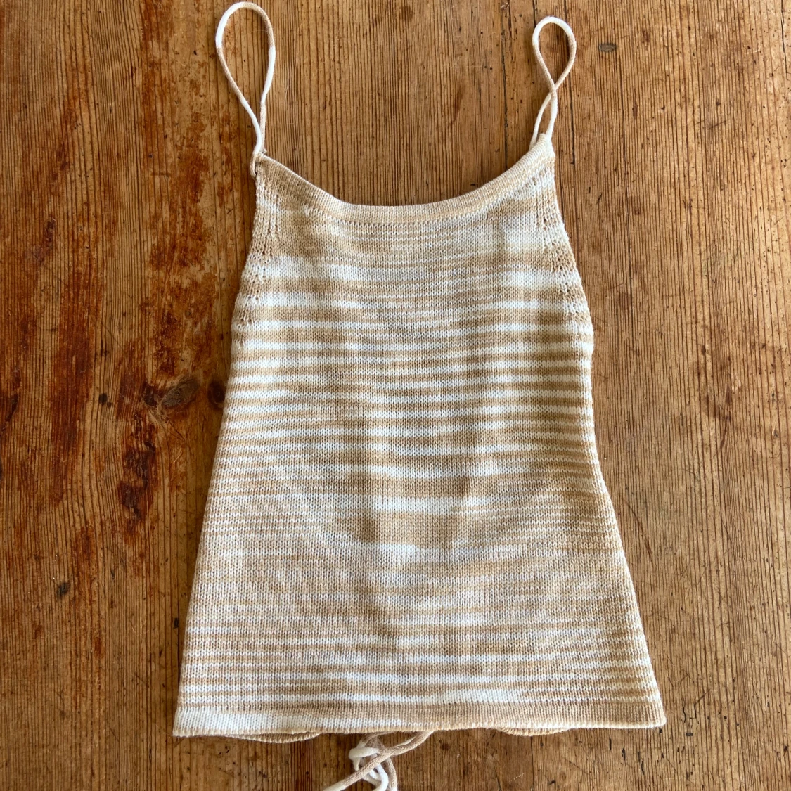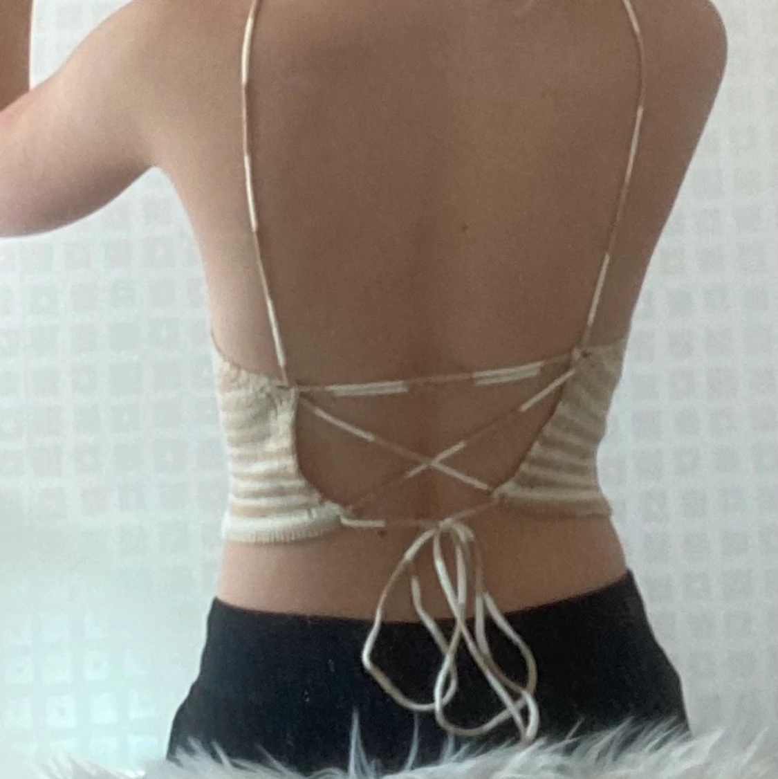 Säljer en stickad beige/vit top med snörning i ryggen. Storlek S. Den är aldrig använd💞