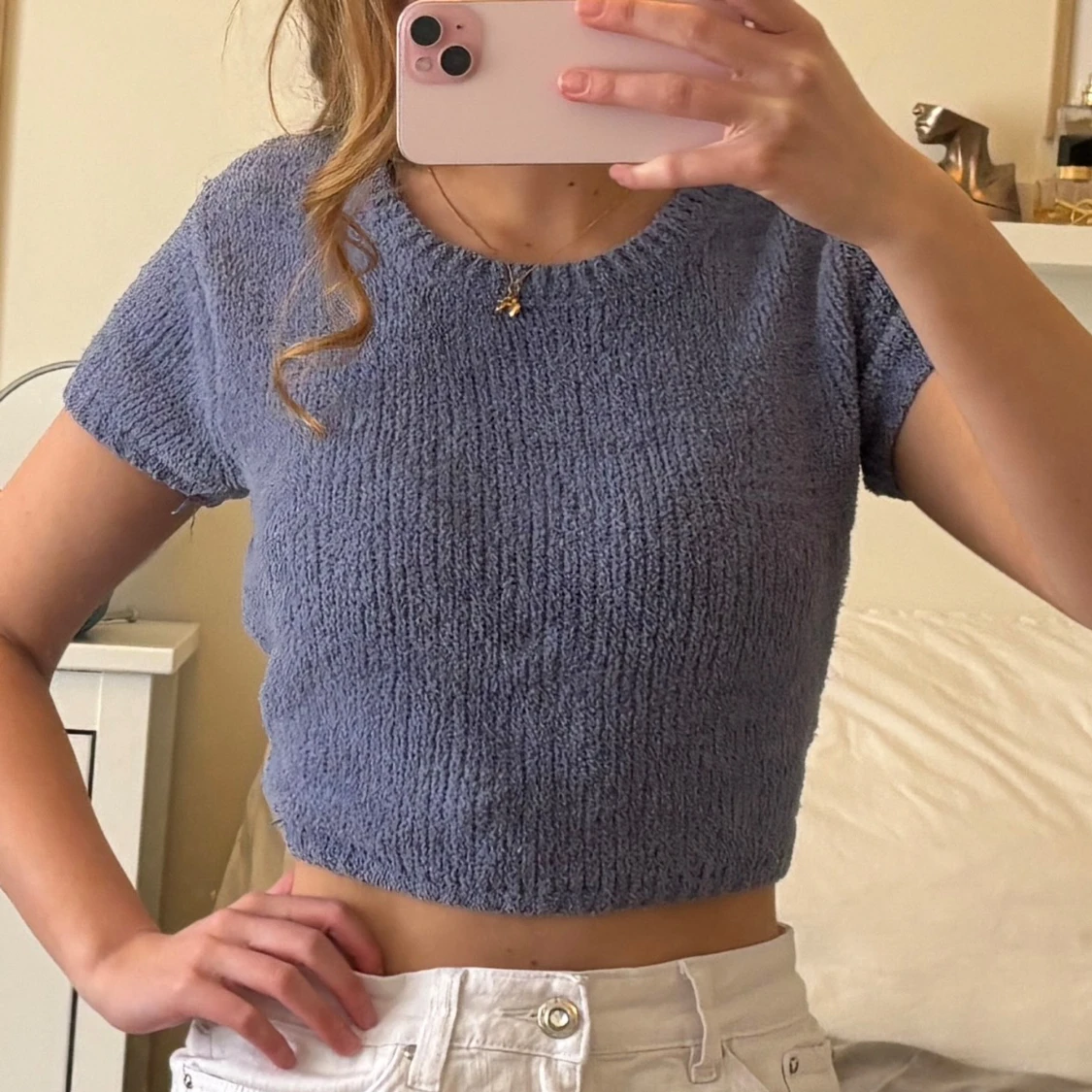Säljer en ljuslila croppad stickad topp med korta ärmar och rund halsringning. Perfekt för dig som vill ha en mysig men ändå trendig look. Superfin till både jeans och kjol!