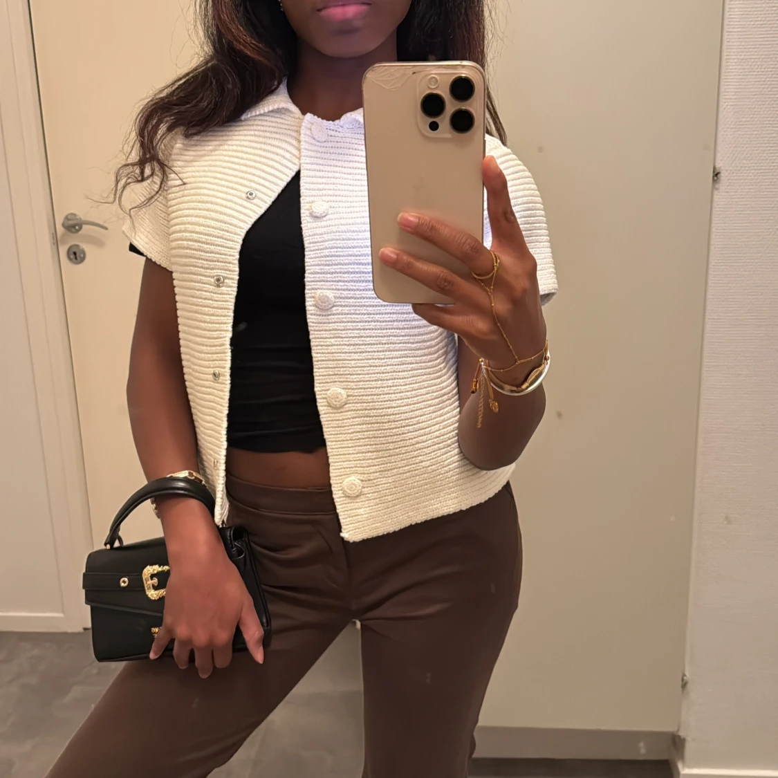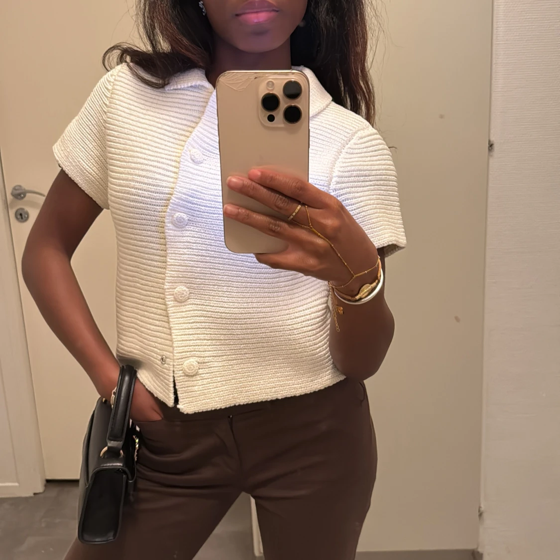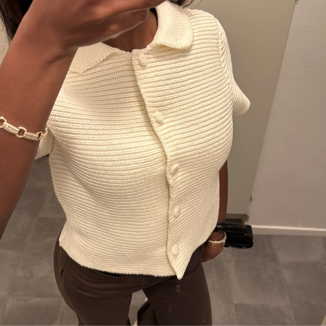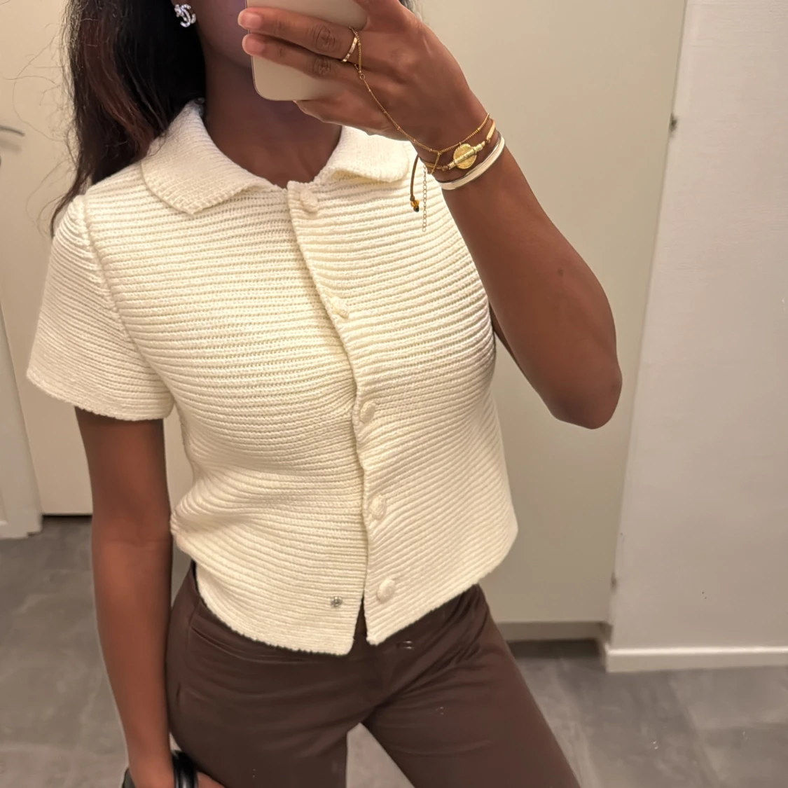 Vit stickad kofta med korta ärmar, krage och stora knappar framtill. Koftan är ribbad och har en croppad passform som ger en fräsch och modern look 🎀❄️
