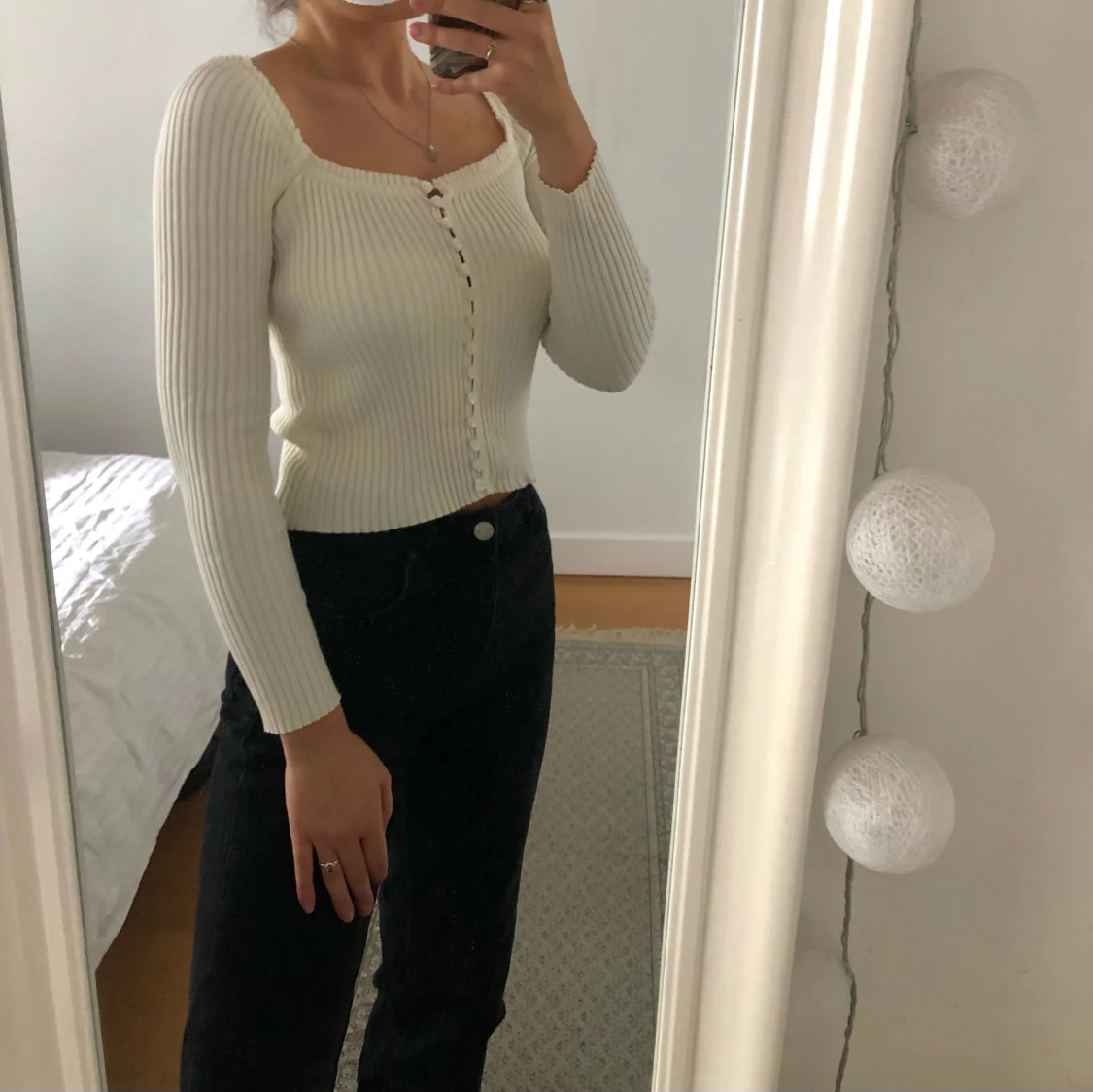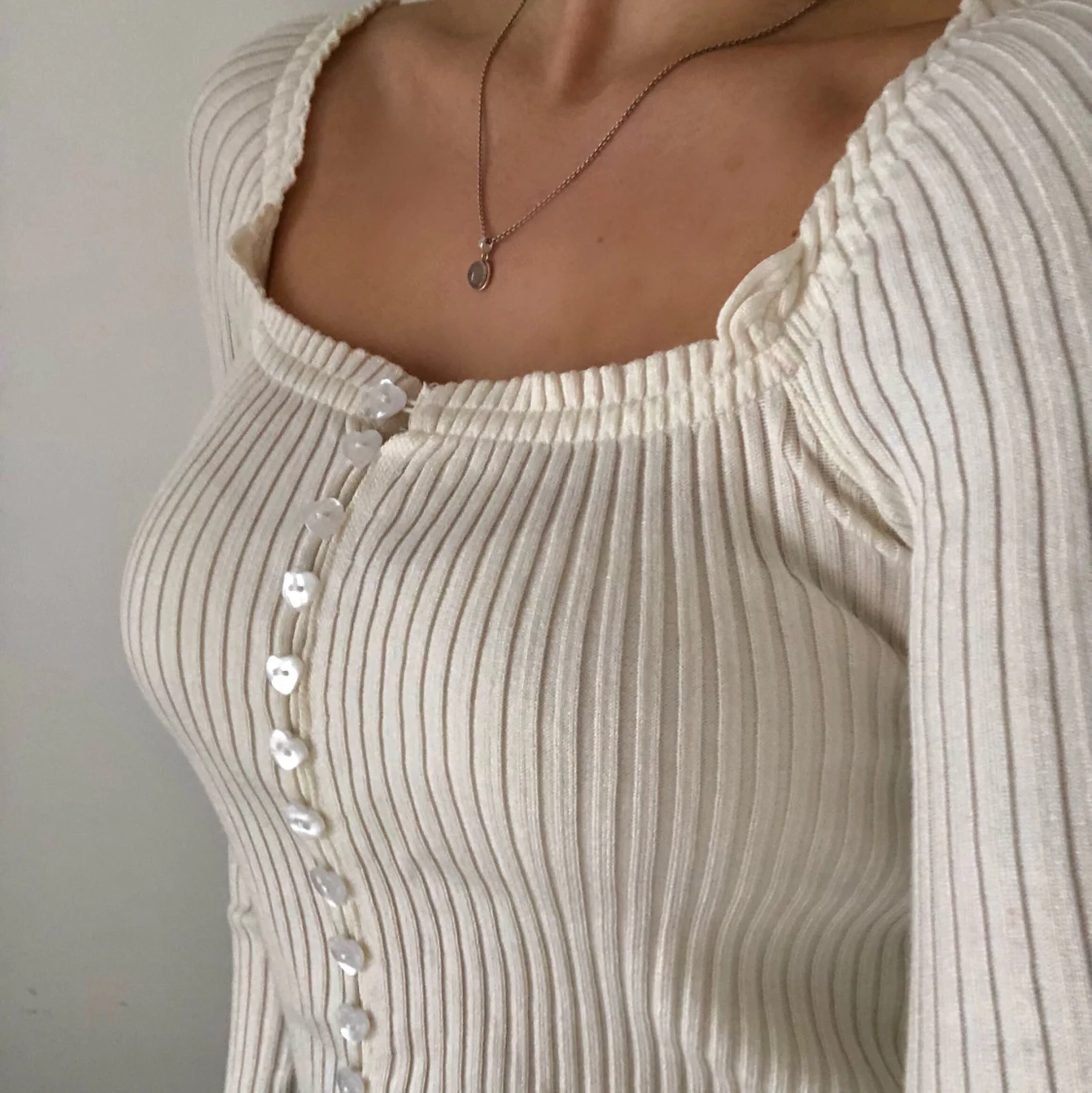 Super fin stickad topp med hjärt-knappar från Verge Girl!! Den är i nyskick och är knappast använd. Den har resår i ärmen så man kan ha den både off-shoulder och som vanligt! 🤍🤍