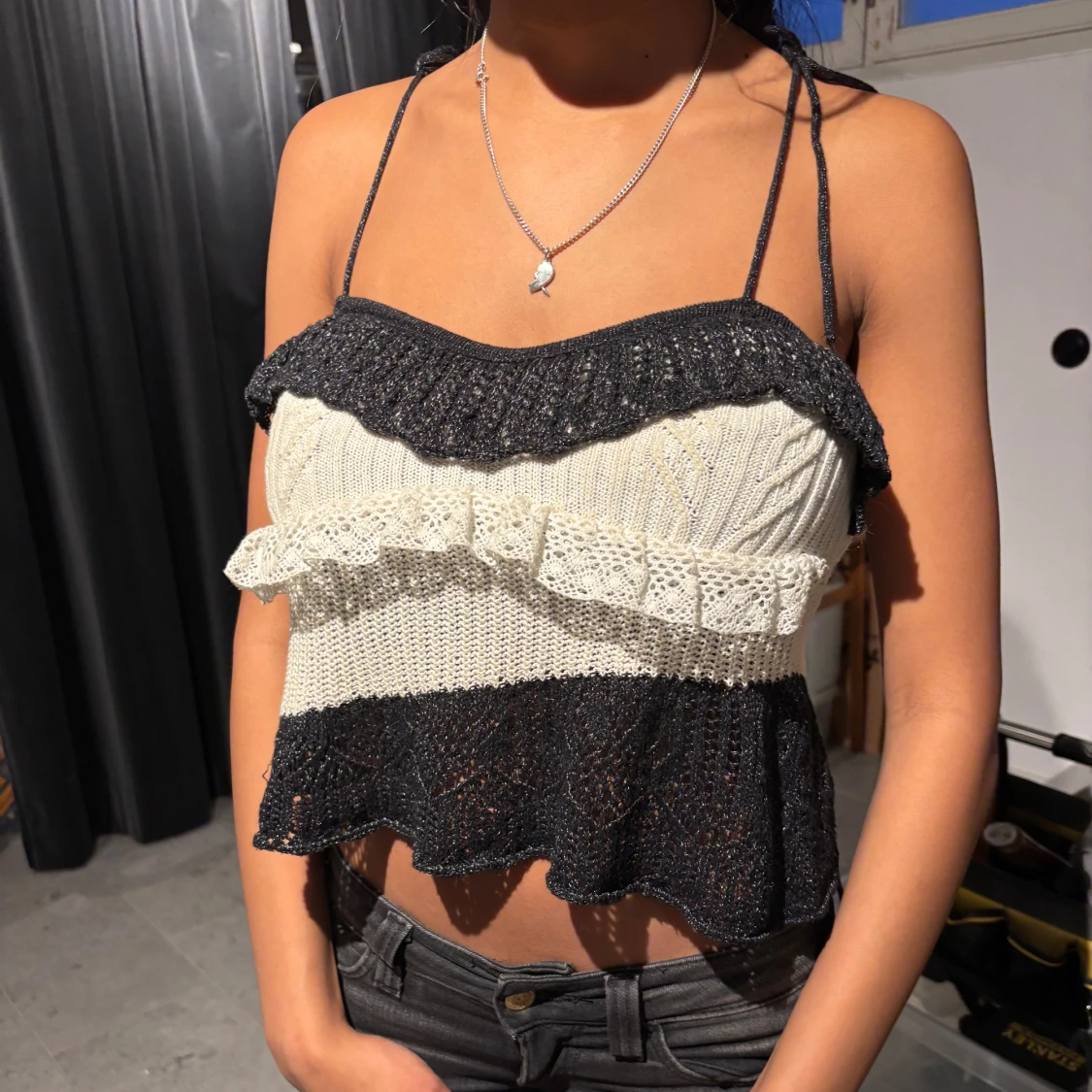 Snygg stickad topp med smala axelband och volangdetaljer. Toppen har en randig design i svart och vit med en croppad passform. Perfekt för en trendig look.💘💘💕