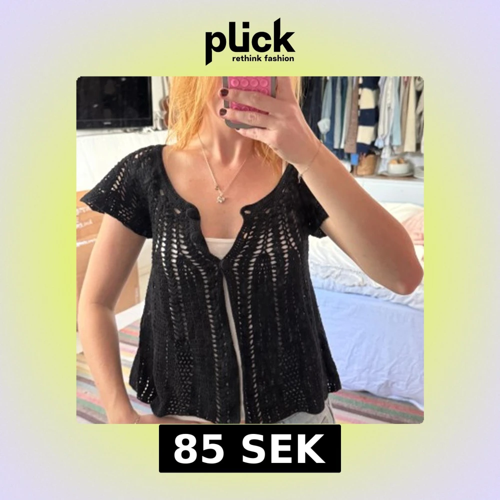 Säljer en svart virkad blus med korta ärmar och snyggt mönster. Blusen har tre knappar framtill och är lätt transparent, perfekt att ha över ett linne. Den har en luftig och avslappnad passform med fina virkade detaljer.