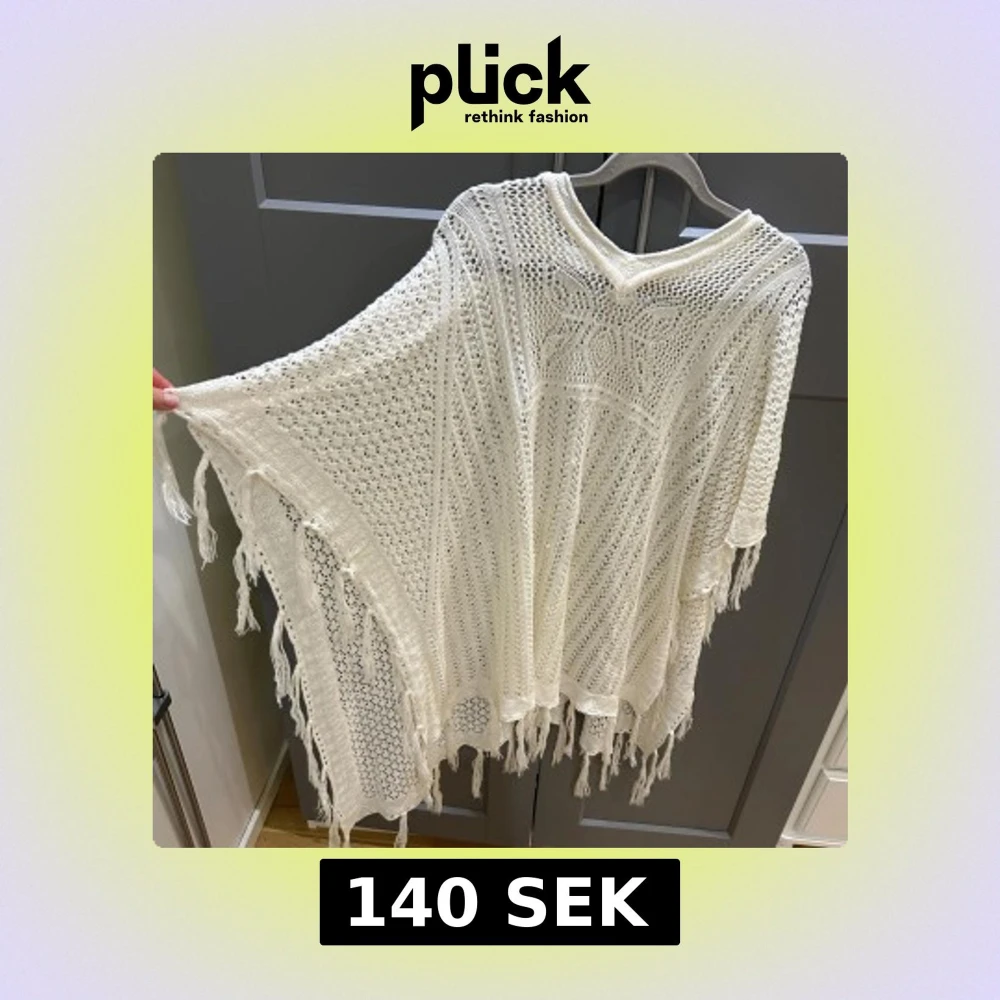 Säljer en vit stickad bolerotopp/ poncho från MinMilo i storlek L/XL. Toppen har ett luftigt hålmönster, v-ringad hals och fransar längs kanterna för en boho-vibe.