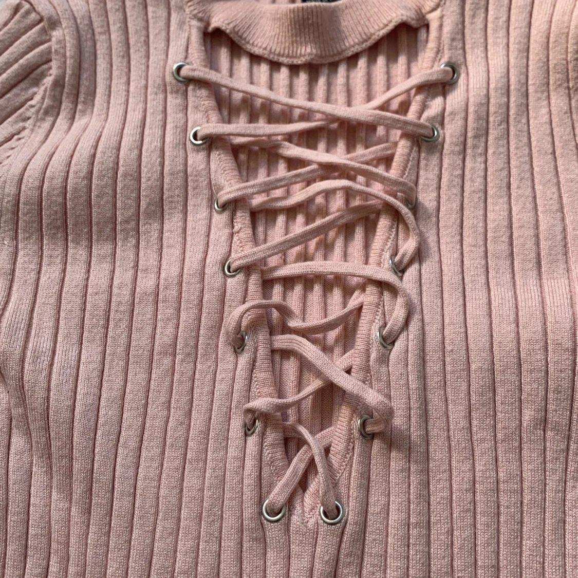 Rosa magtröja med en laceup detalj över urringningen. Tröjan består av ett stretchiga ribbat tyg, ser ut som om det är stickat. Bra skick, inga skador eller slitage.