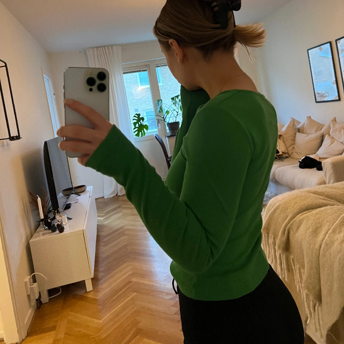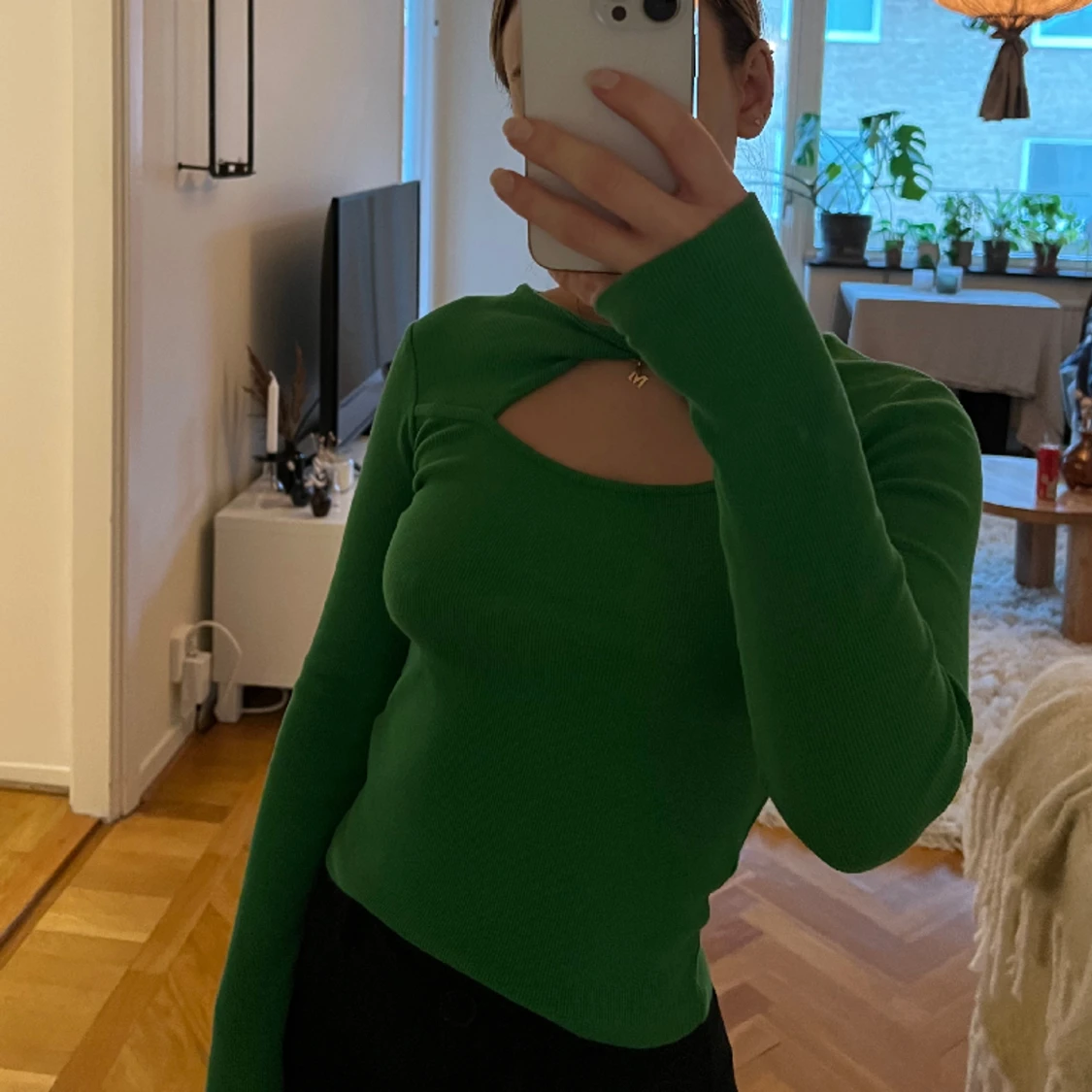 Tunnare grön stickad tröja med cutout över bröstet från Gina Tricot. Aldrig använd. Storlek XS. 75:- ex frakt.