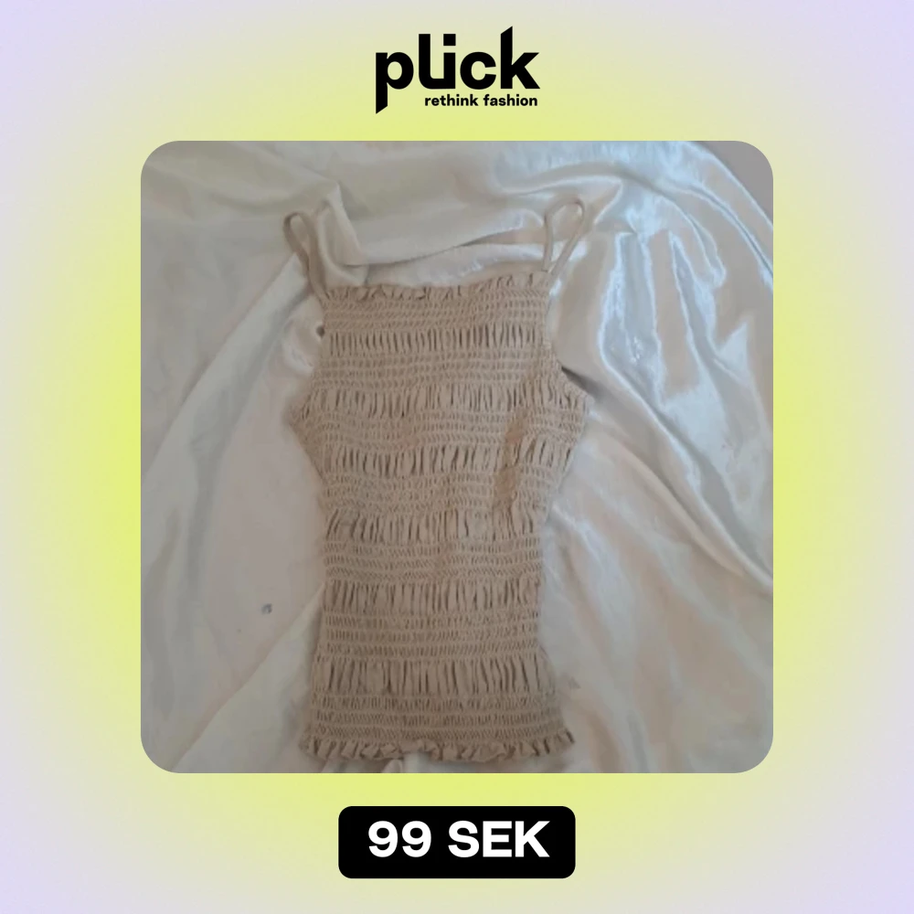Säljer en superfin beige smockad topp från H&M. Den är ärmlös med smala axelband och har en tight passform som är perfekt för sommaren. Materialet är mjukt och stretchigt, vilket gör den bekväm att bära hela dagen.