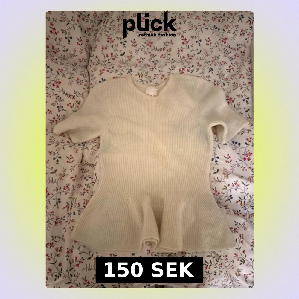 Supersöt ribbad topp i vitt med korta ärmar och volangkant nedtill. Nästan aldrig använd så väldigt bra skick