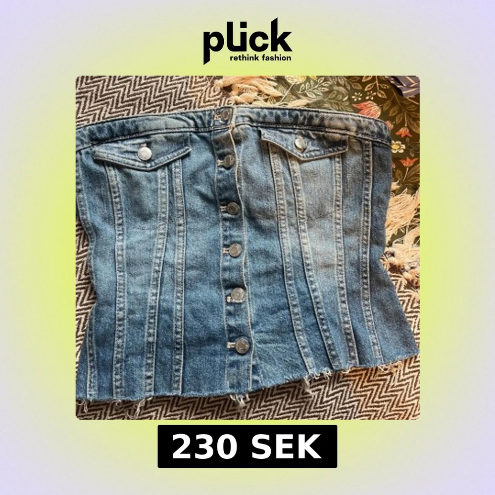 Säljer en snygg jeans tubtopp från Zara i medium. Toppen har knappar framtill, två bröstfickor med lock och rå kant nertill. Baksidan har smock för extra stretch och passform. Perfekt för dig som gillar denim och vill sticka ut.