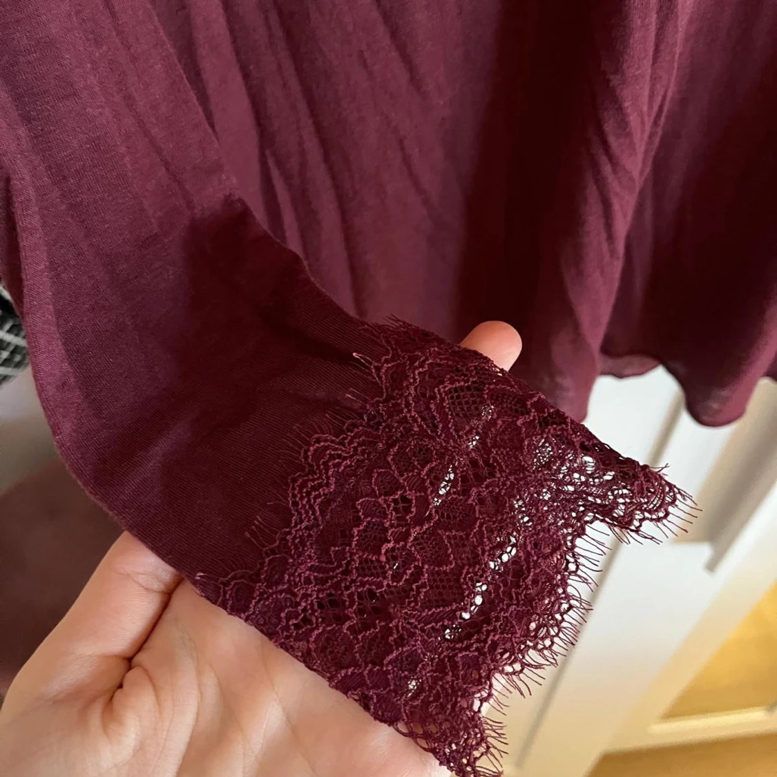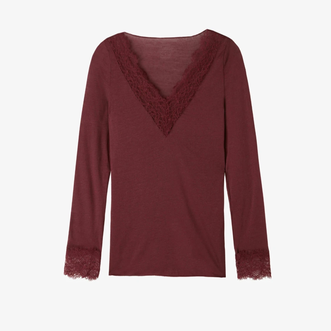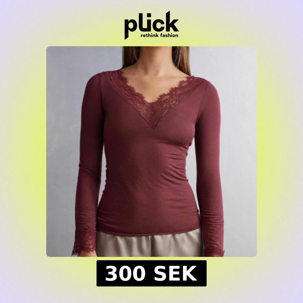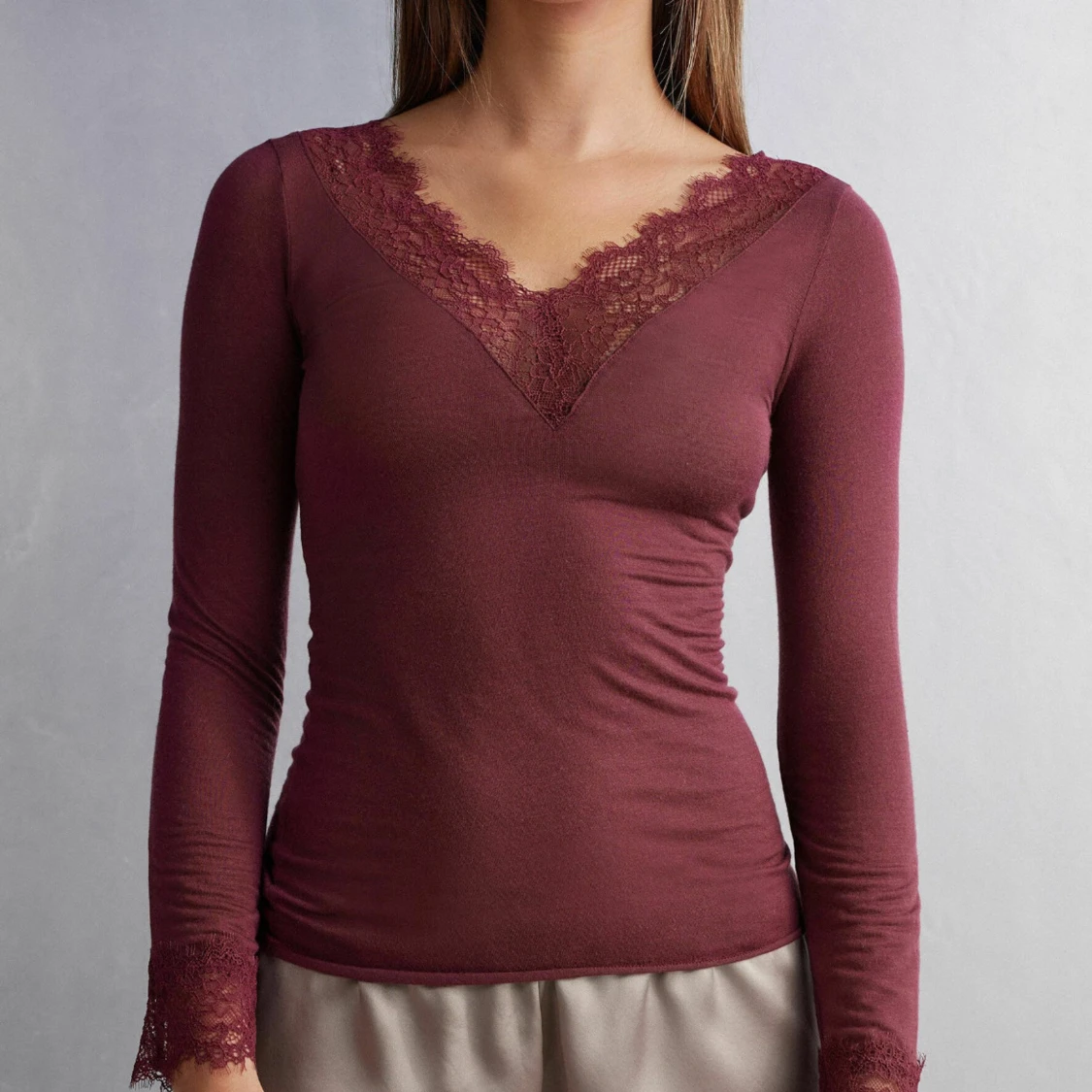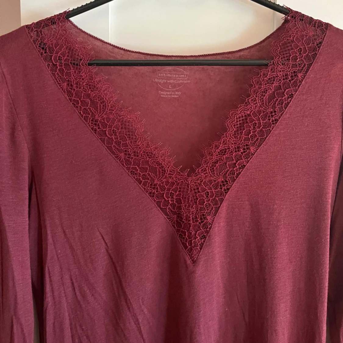 Supersnygg vinröd långärmad topp från Intimissimi med v-ringning och spetsdetaljer vid halsringning och ärmslut. Tröjan är endast använd en gång och är i super bra skick!