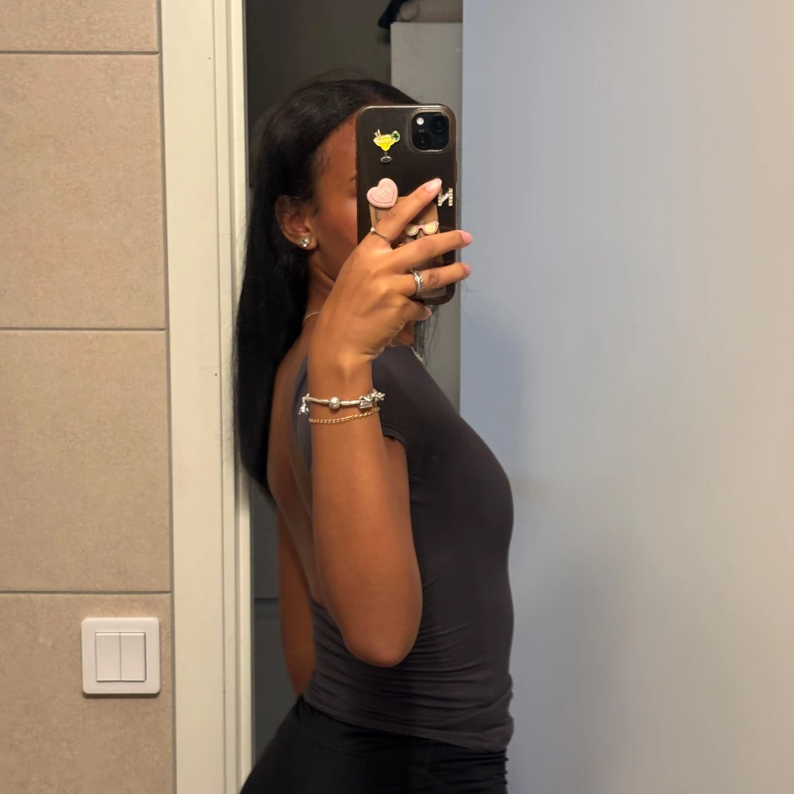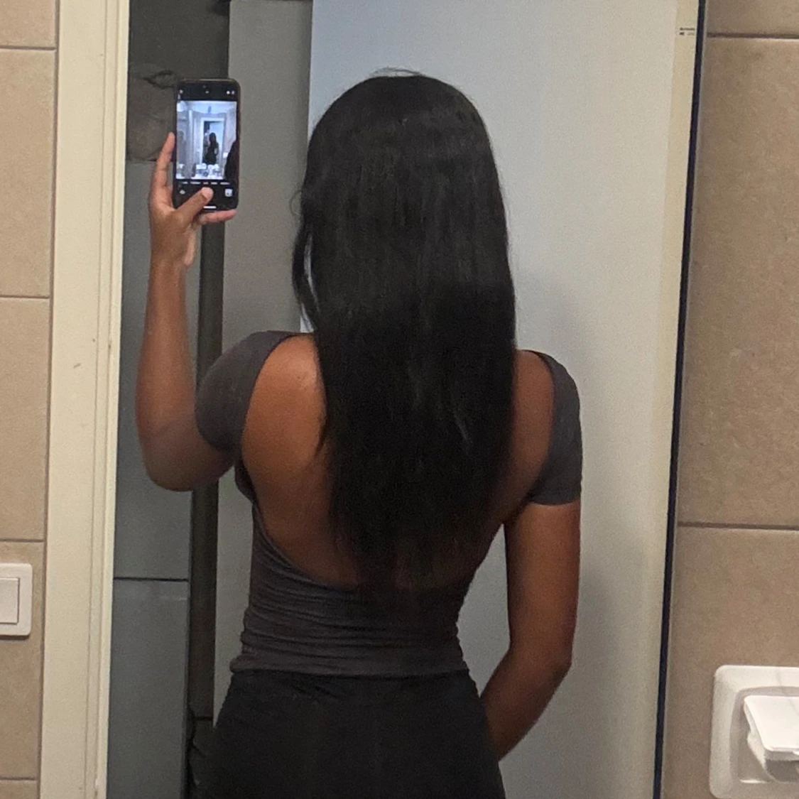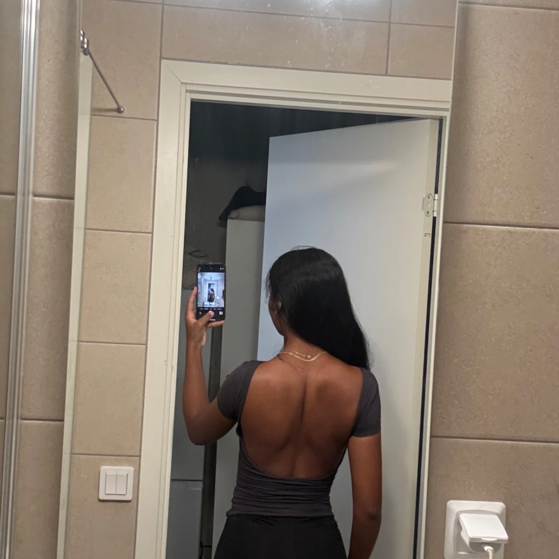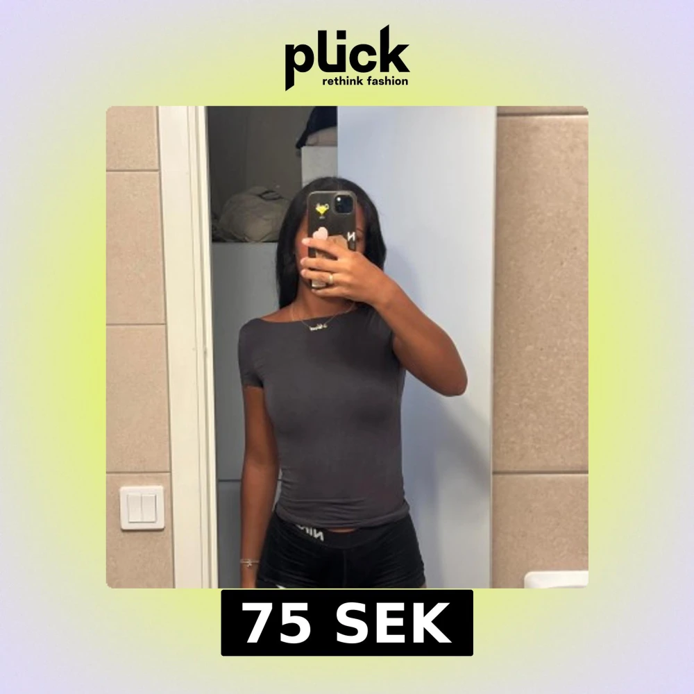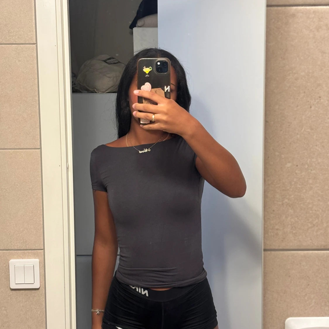 Säljer en mörkgrå, tight topp med korta ärmar och riktigt snyggt öppen rygg. Toppen har en rundad hals och sitter slim på kroppen. Perfekt om du vill ha en enkel men ändå cool look. Materialet känns mjukt och stretchigt, troligen bomull eller polyester.