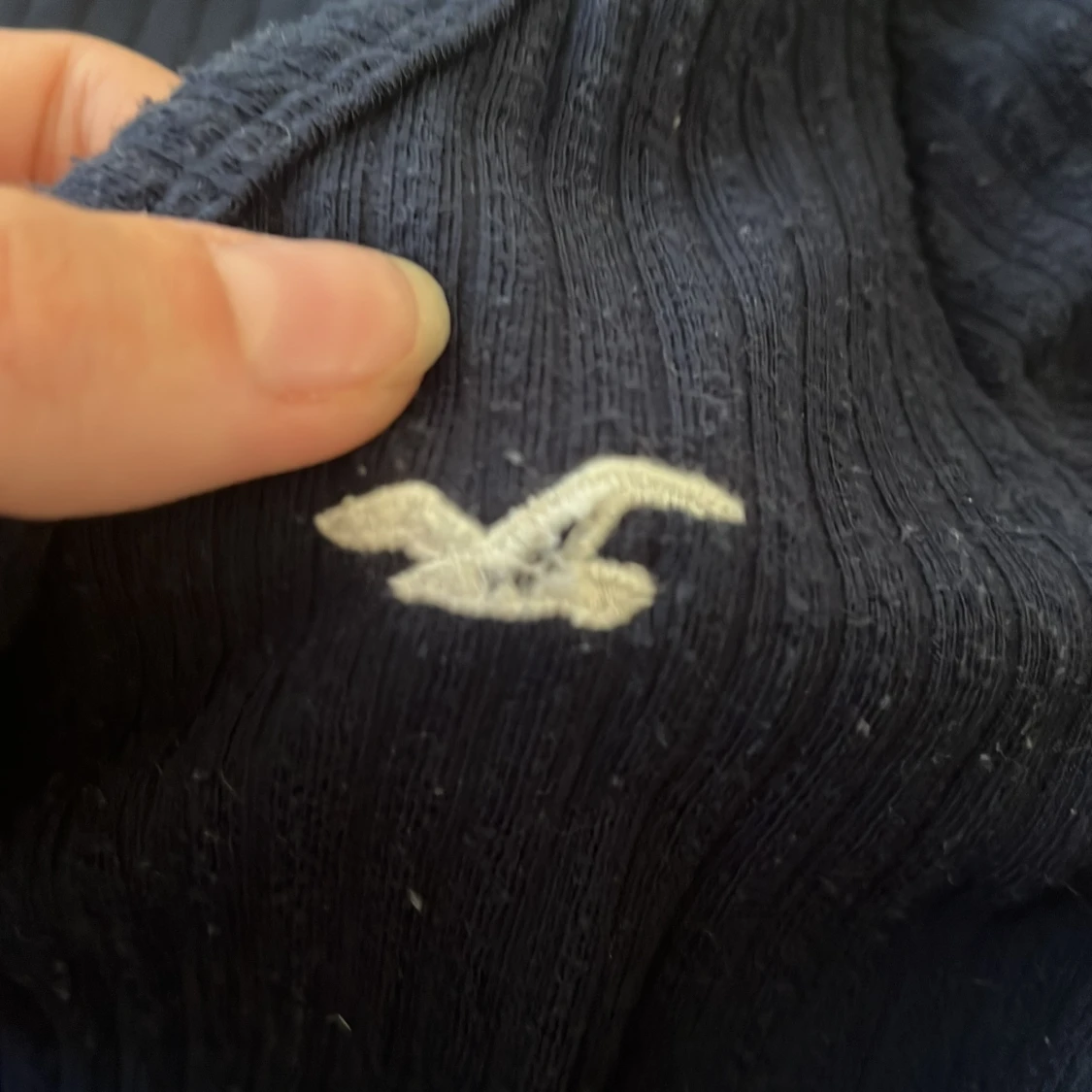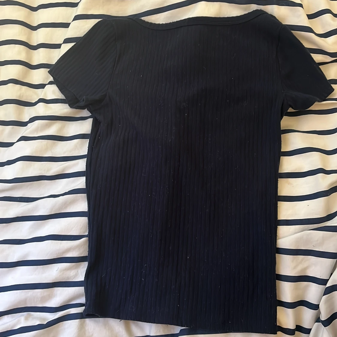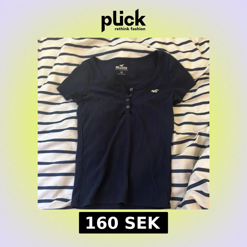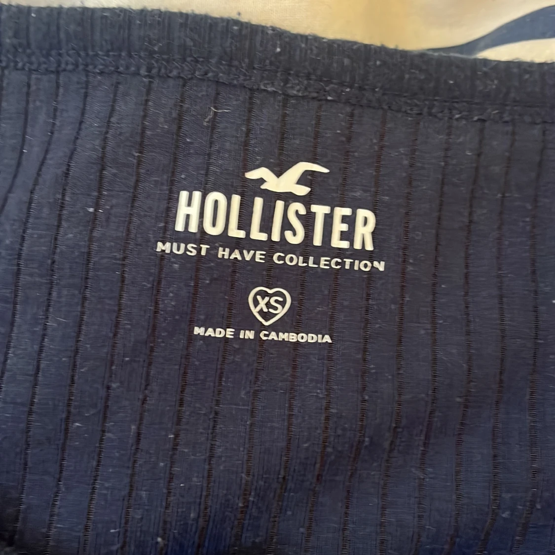 Säljer en mörkblå ribbad topp från Hollister Must Have Collection i storlek XS. Toppen har korta ärmar, rund halsringning och knappar framtill. Liten broderad Hollister-logga på bröstet (defekt). Perfekt basic med snygg passform.