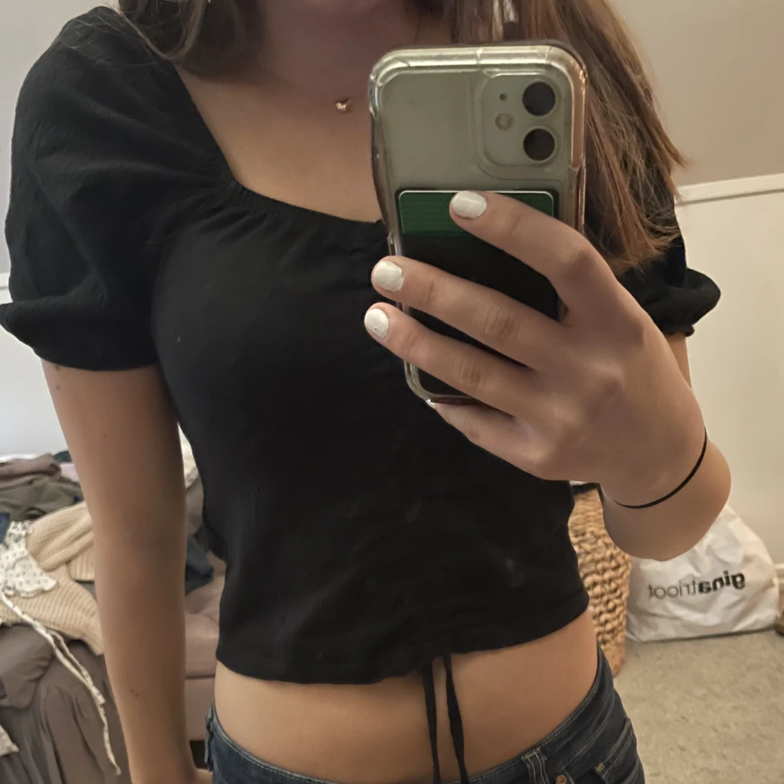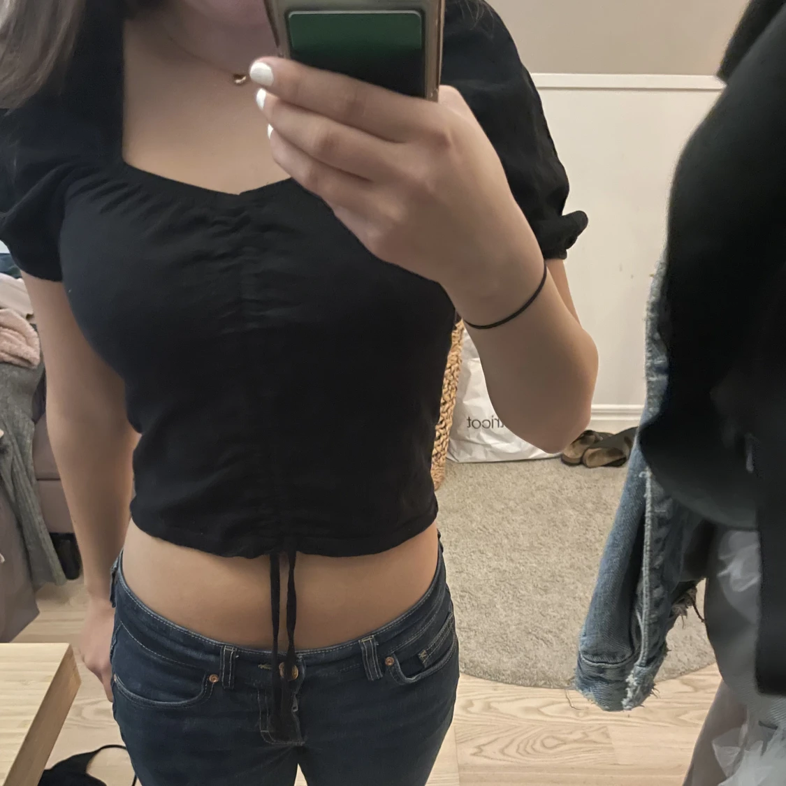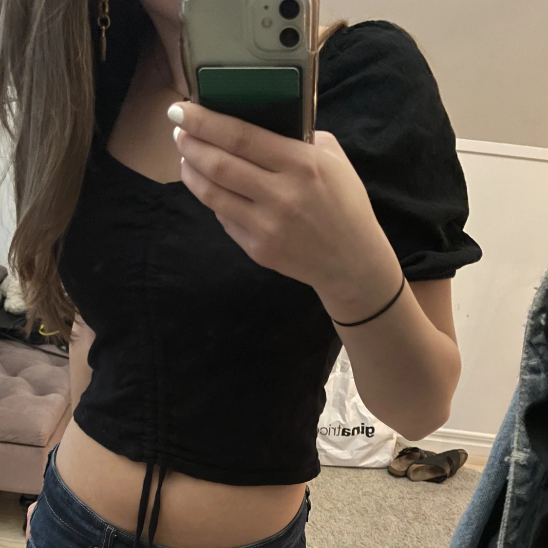 Jättefin svart topp med puffärmar och band som går att spänna åt så toppen blir kortare❤️storlek XS men passar även S. Köp direkt för 250kr eller lägg prisförslag kan tänka mig och sänka❤️