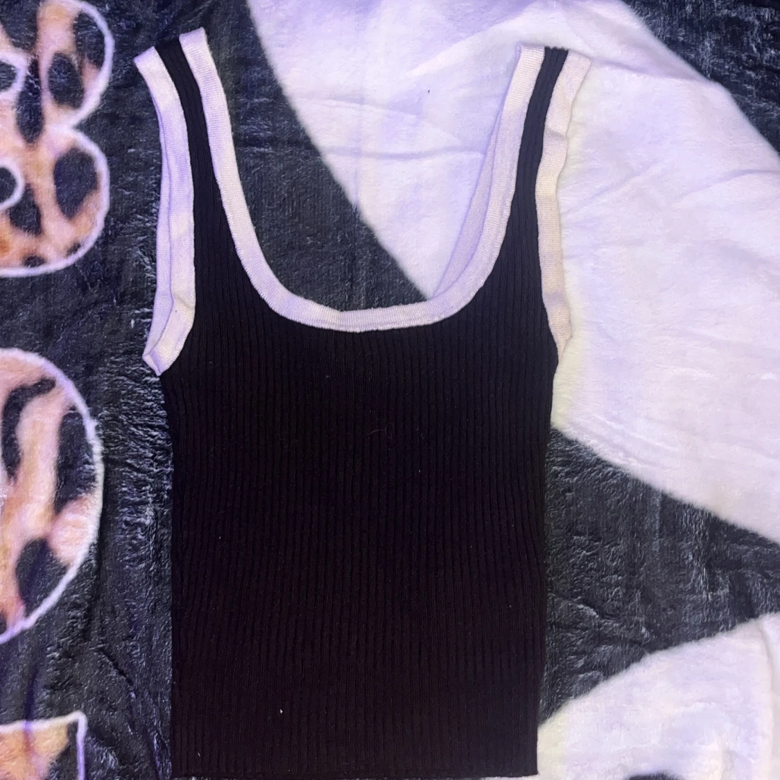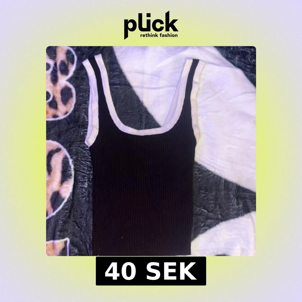 Snygg svart ribbad linnetopp med breda axelband och kontrasterande vit kant runt halsringning och ärmhål. Perfekt att styla med jeans eller kjol för en cool och enkel look.