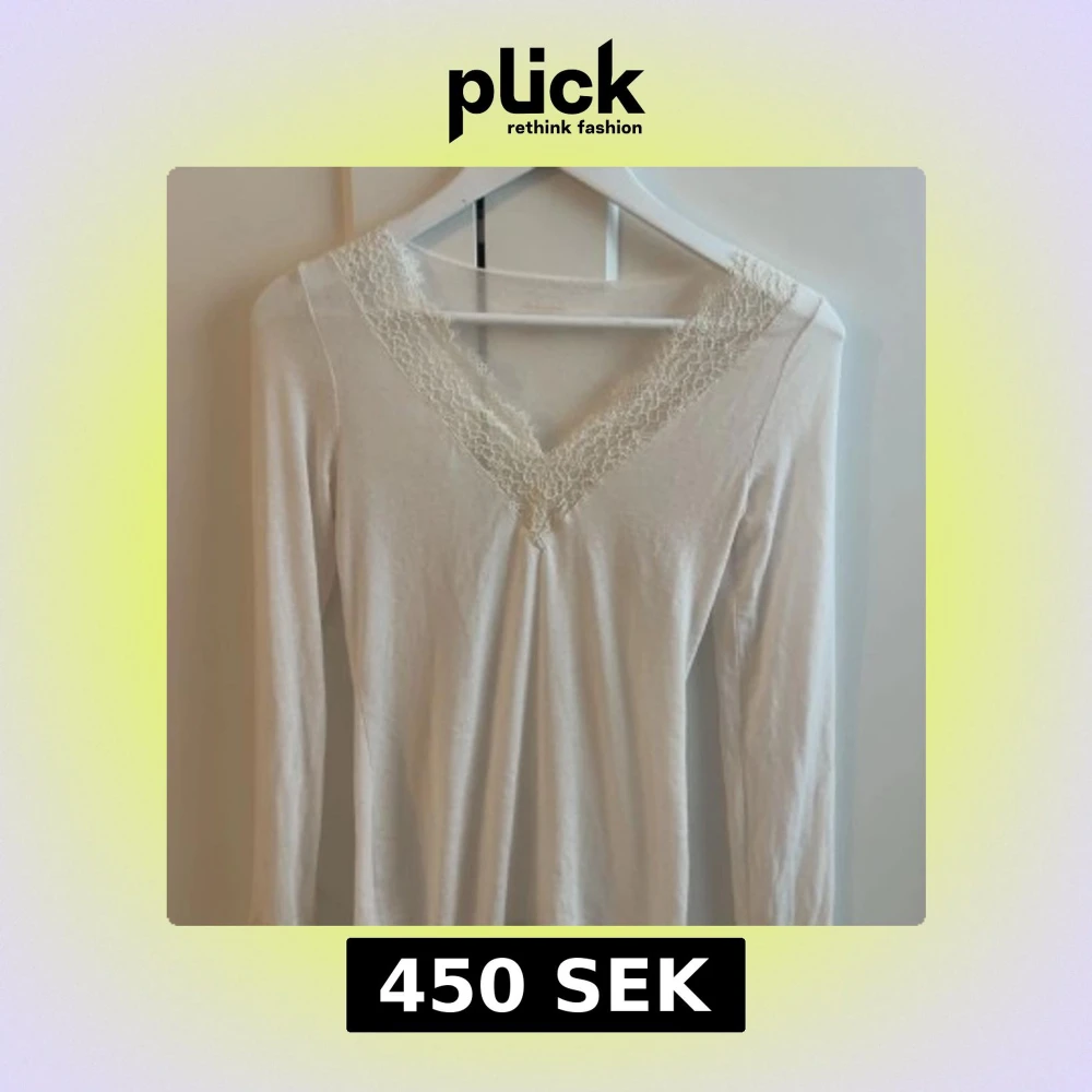 Säljer en vit långärmad topp med v-ringning och fina spetsdetaljer runt halsen. Toppen är i mjukt material och har en feminin och enkel design som passar perfekt till jeans eller kjol. Ordinarie pris 559kr
