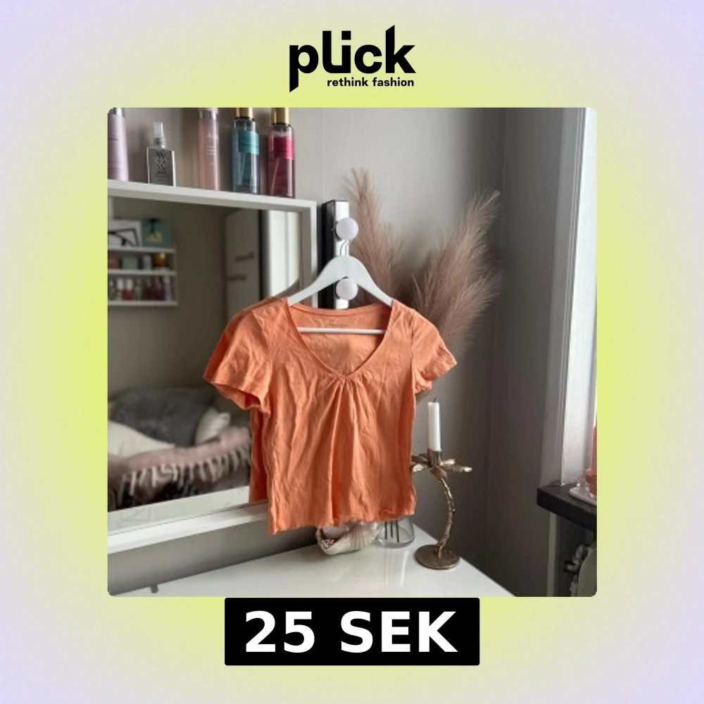 Superfin persikofärgad topp från KappAhl med v-ringning och lätt rynkdetalj framtill. Modellen är croppad och har korta ärmar, perfekt för en fräsch och avslappnad look. Tillverkad i mjuk bomull som känns skön mot huden.