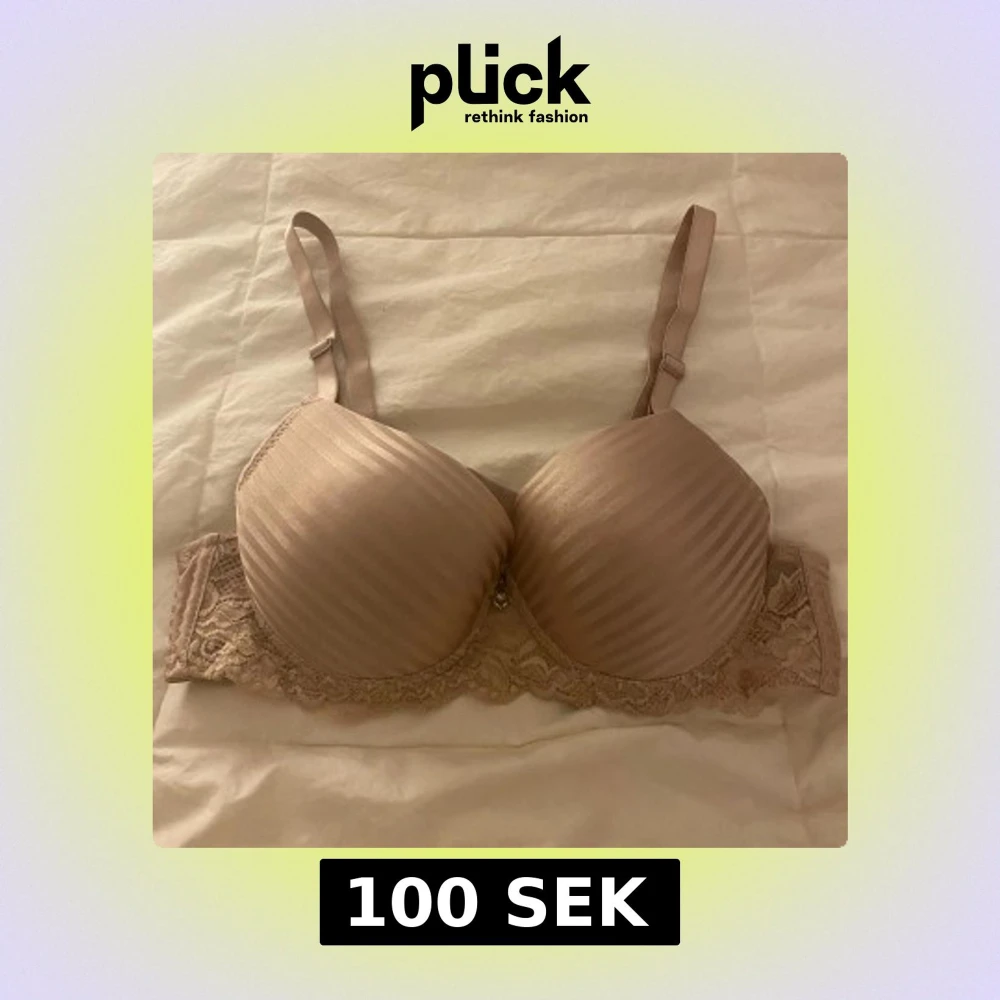 Säljer en rosa pushup bh med ränder och spetsdetalj längs kanten. Den har justerbara axelband och en liten hjärtformad dekoration framtill.