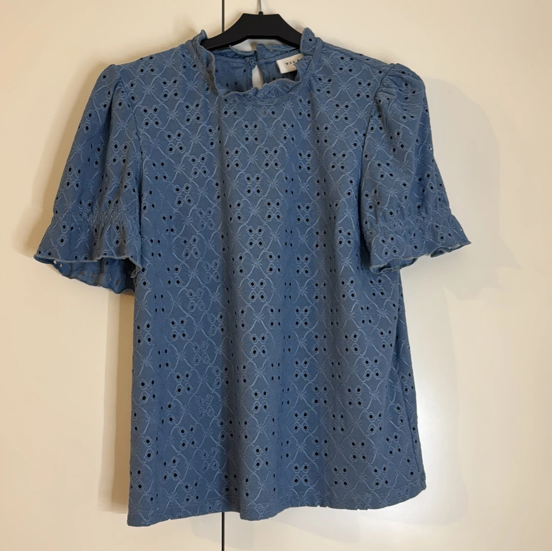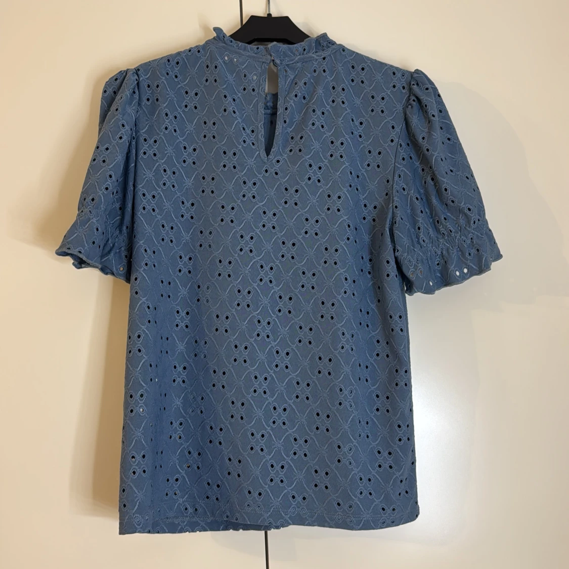 Säljer en söt blå blus från Vila med broderad design och korta ärmar. Blusen har en rund hals och en knappdetalj i nacken. Perfekt för en somrig look!