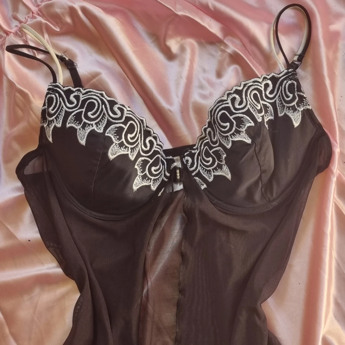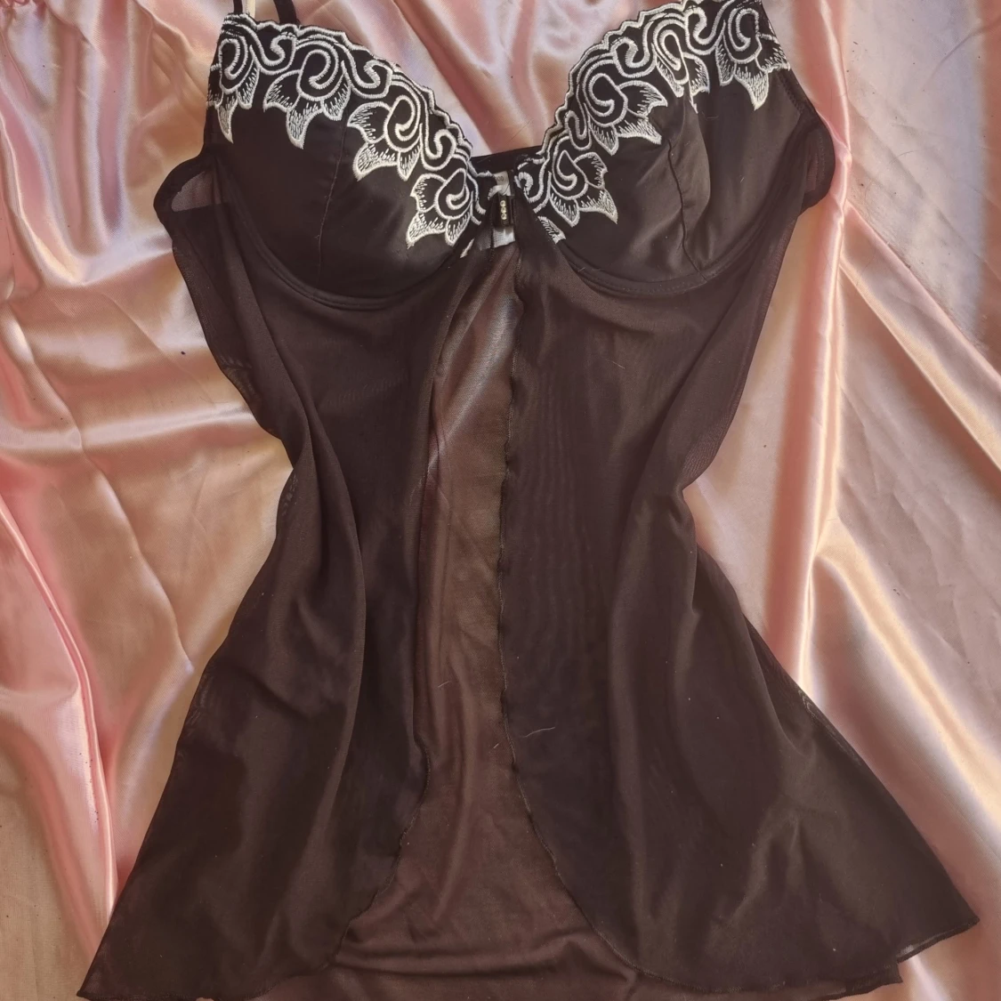 Elegant svart nattlinne med vackra vita spetsdetaljer vid bysten. Tillverkat i ett lätt och luftigt material som ger en lyxig känsla. Perfekt för en speciell kväll.