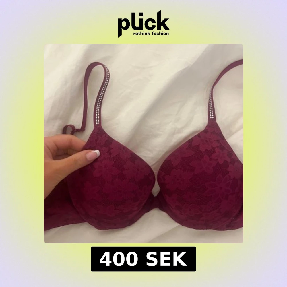 Säljer en ny vinröd push-up bh från Pink med blommigt spetsmönster och dekorativa stenar på axelbanden. Perfekt för att ge extra lyft och form. Axelbanden är justerbara för bästa passform.