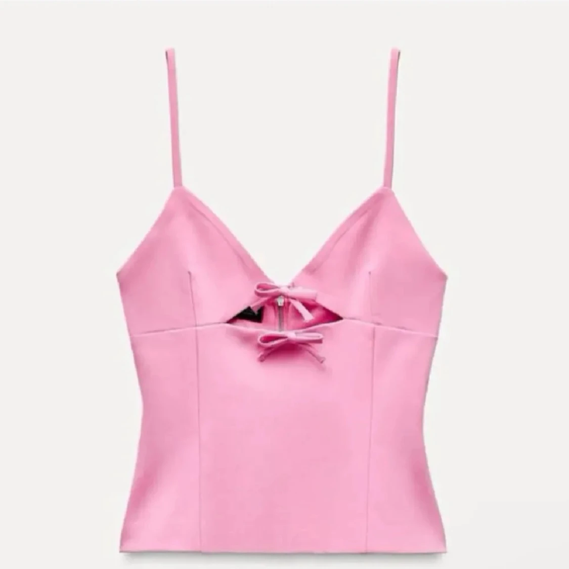 Supersöt rosa korsettopp med smala axelband och två dekorativa rosetter framtill. Toppen har en liten cut-out mellan rosetterna som ger en extra detalj. Toppen är i storlek xs, skriv om du har frågor! Använd en gång!