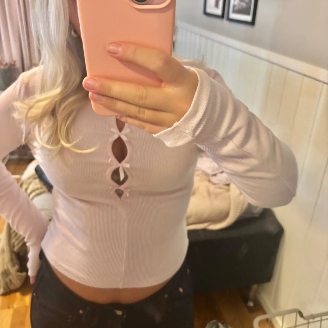 Supersöt ljusrosa långärmad topp med ribbad struktur och tre små rosetter framtill som ger en unik look. Toppen är croppad och har snygga cut-outs längs bröstet. Perfekt för dig som gillar detaljer och en feminin stil.