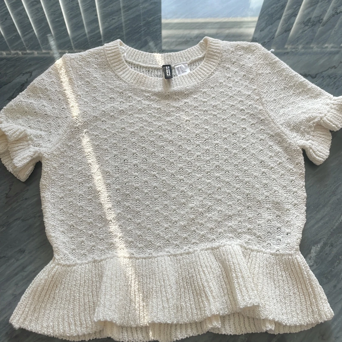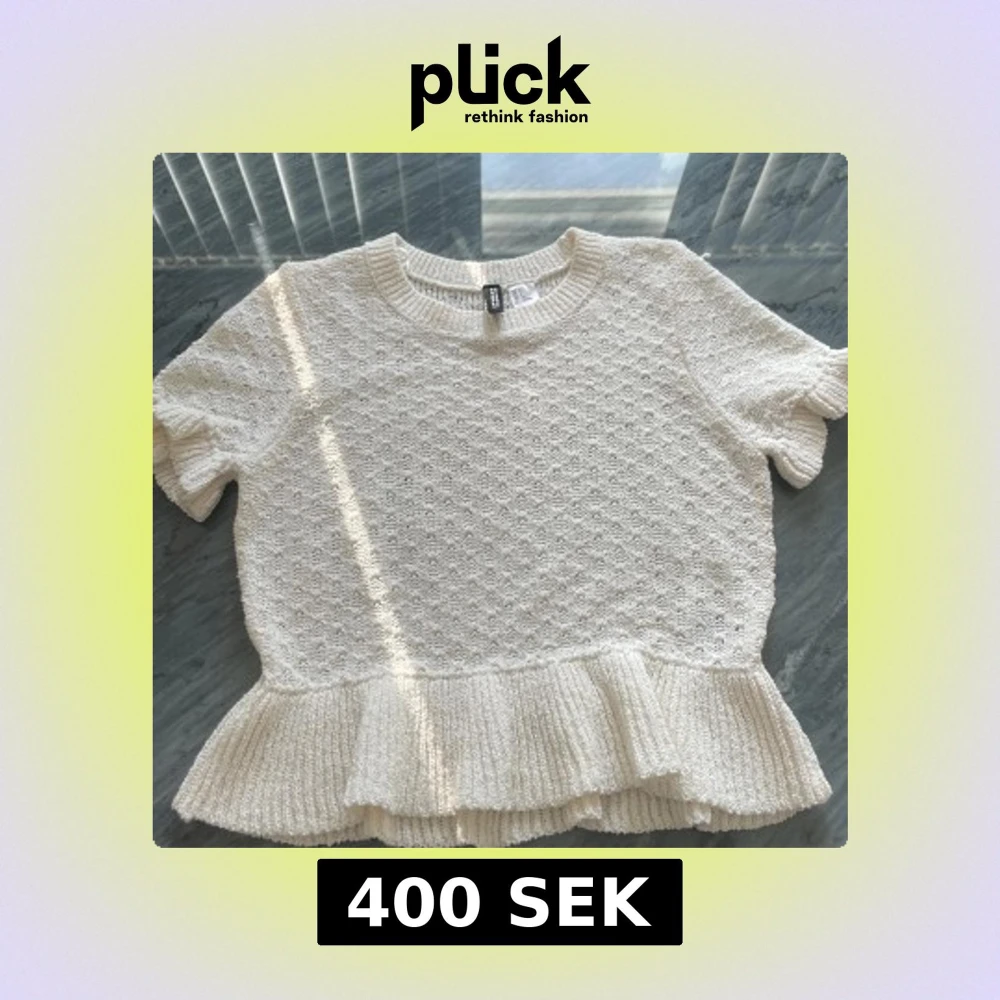 Säljer en söt vit stickad topp från H&M med korta ärmar och volangdetalj vid nederkanten. Är i storlek s men sitter som xs. Säljer då den är för liten.