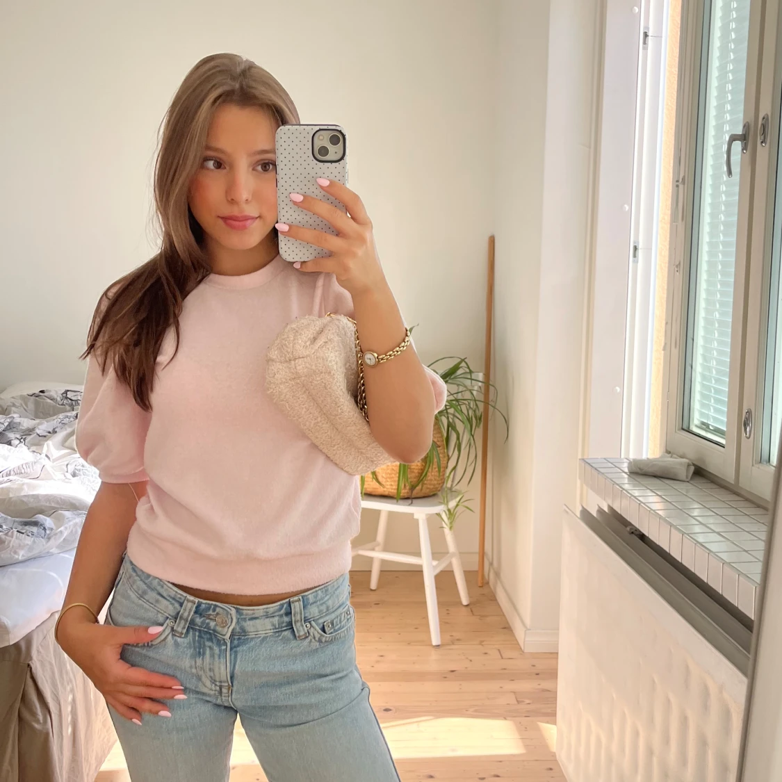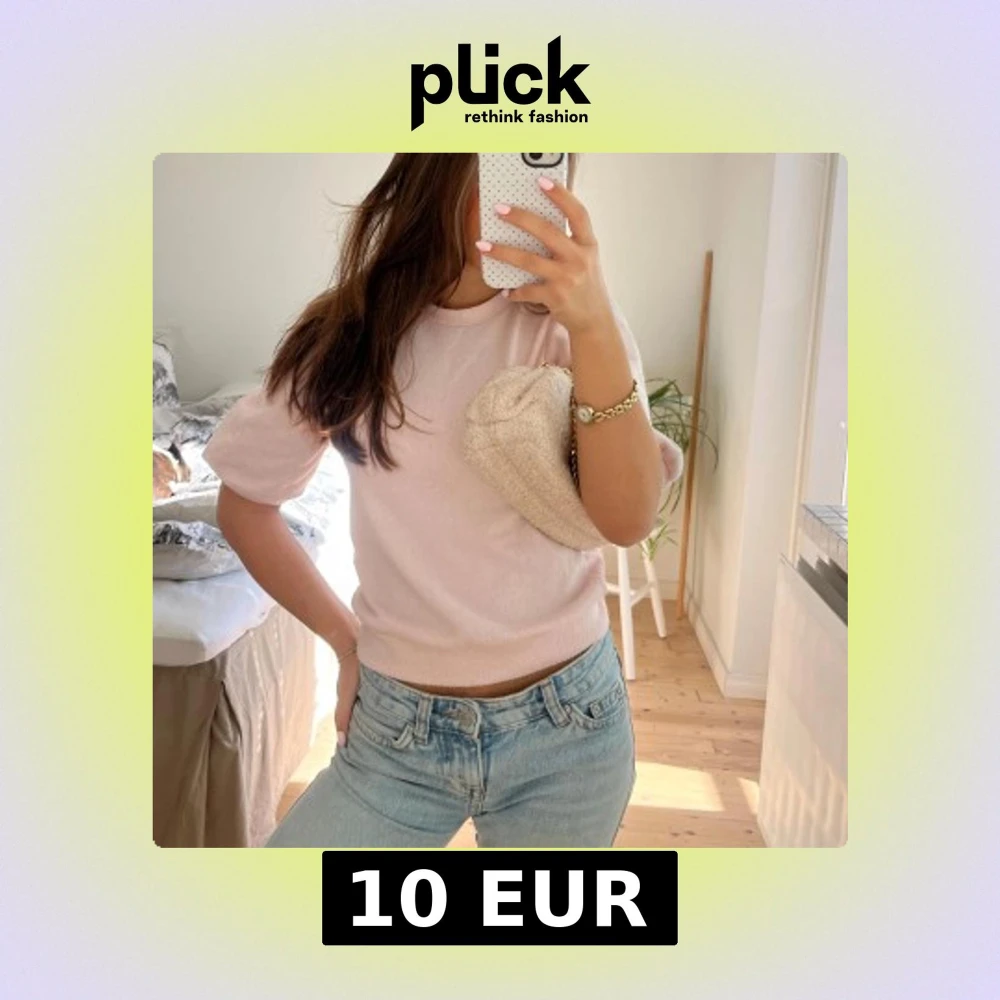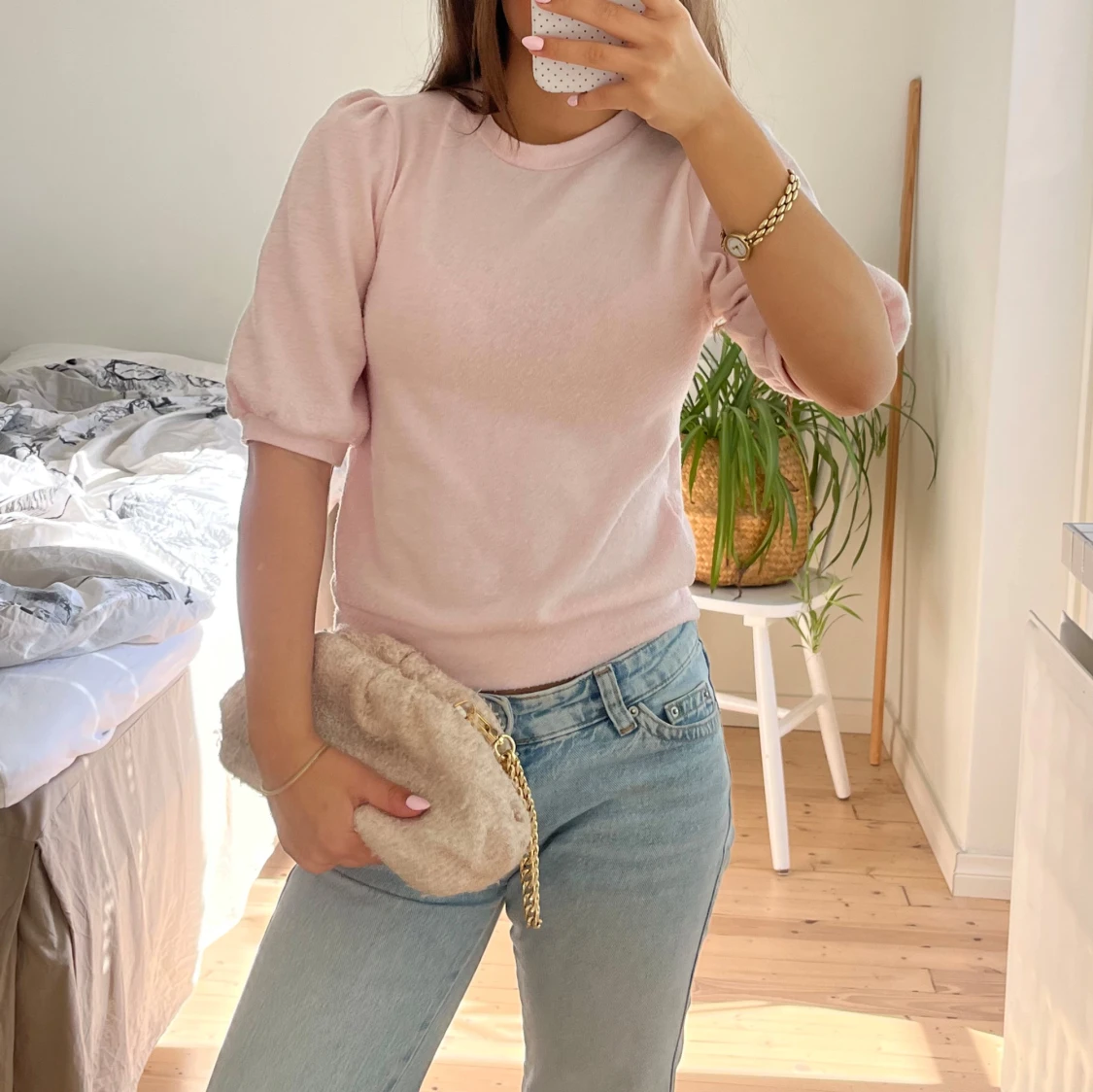 Supersöt ljusrosa stickad topp med korta puffärmar och rund hals. Mjuk och skön, perfekt till jeans eller kjol. Enkel och stilren design som ger en gullig vibe.