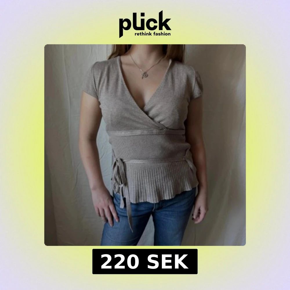 Snygg beige omlottopp med v-ringning och korta ärmar. Toppen har ribbad midja och nederkant samt knytband i sidan. Perfekt att både till vardags och finare tillfällen. Storlek L men passar S/M, modellen på bilden har vanligtvis S.