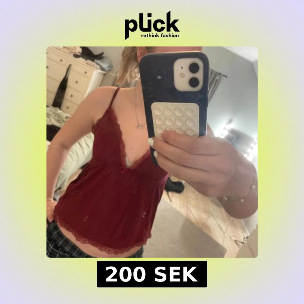 Säljer en vinröd linnetopp från Nelly med tunna axelband, spetsdetaljer längs urringningen och nederkanten samt en liten rosett framtill. Toppen är mjuk och har en feminin look, perfekt för sommaren.