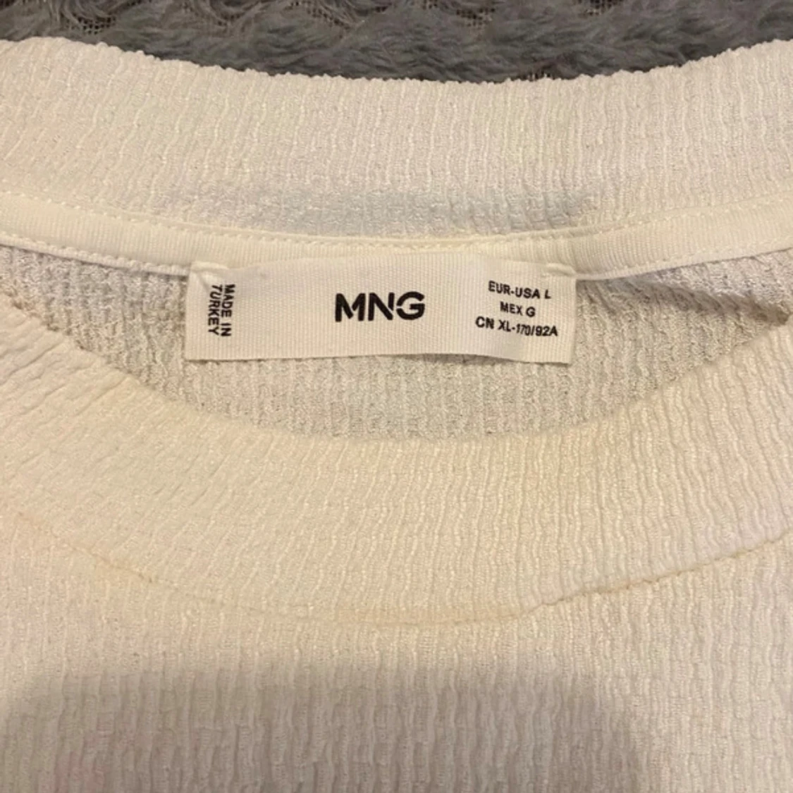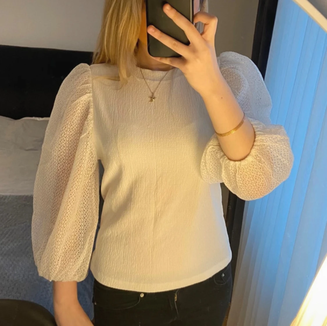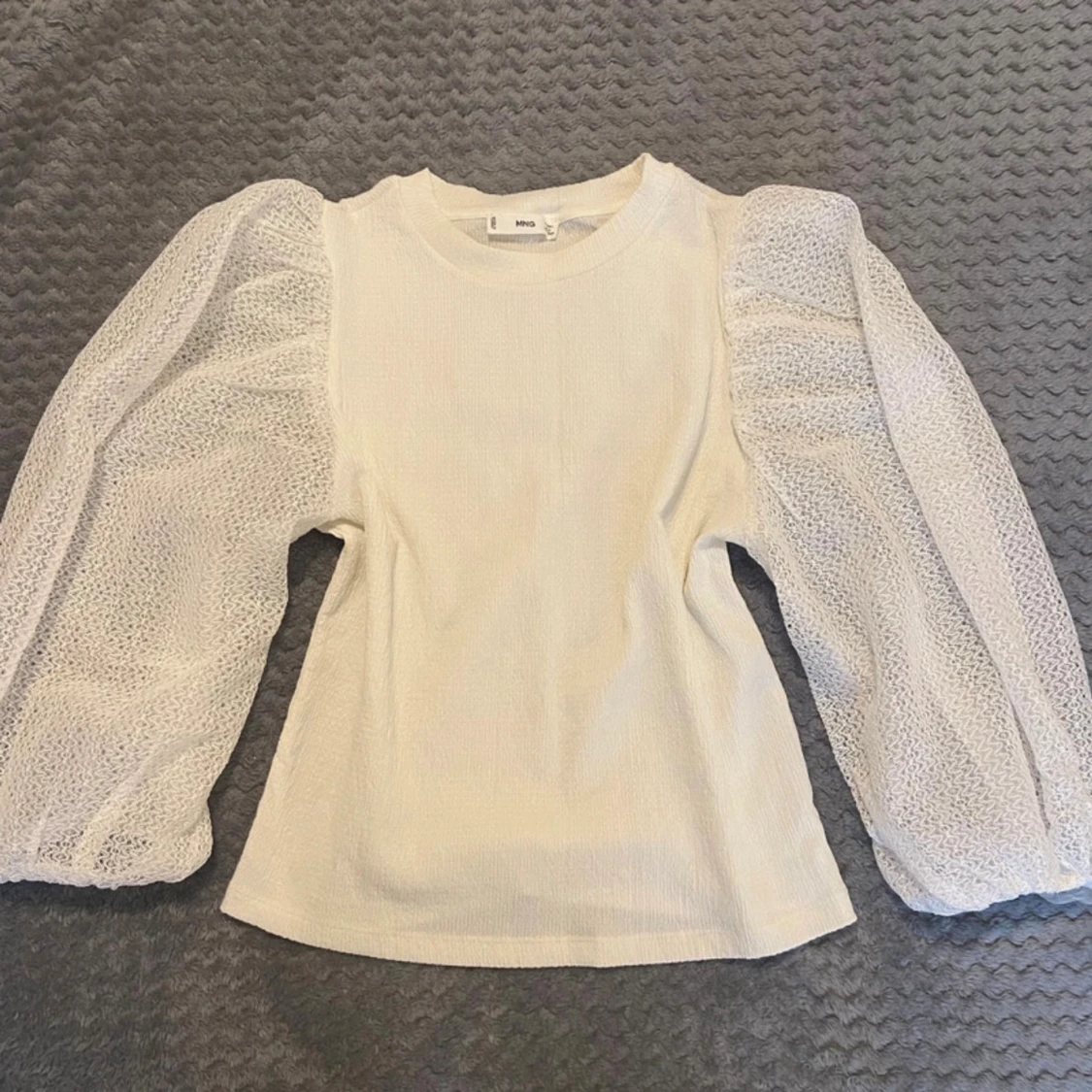 Superfin vit blus från Mango med strukturerat tyg och stora puffärmar i transparent mesh. Blusen har rund halsringning och en rak passform som ger en trendig look. Perfekt att styla med jeans eller kjol för en snygg outfit.