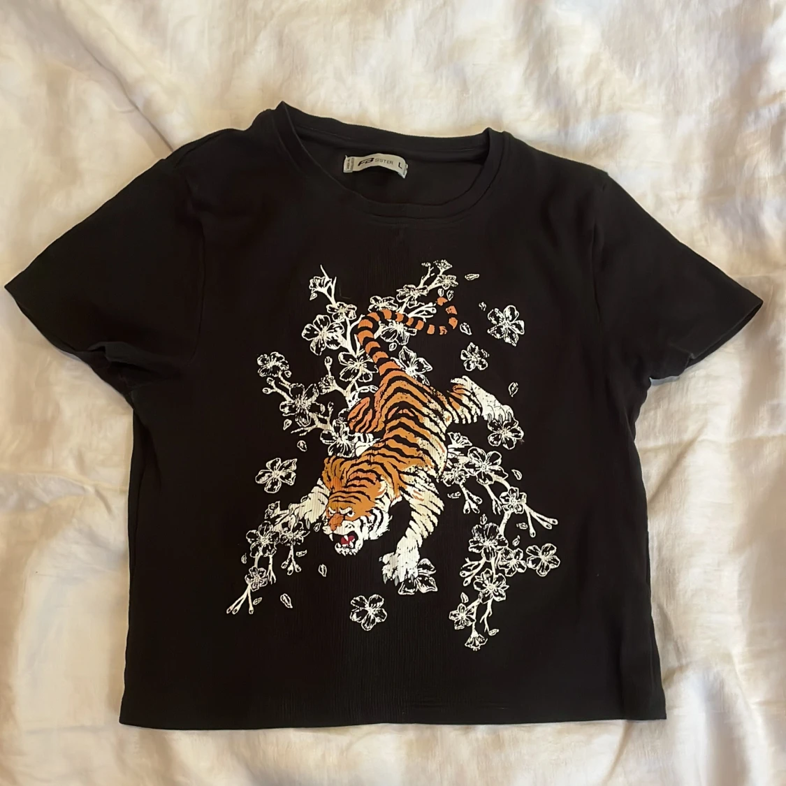 Väldigt fin topp med lejontryck köpt från new yorker. Väldigt fint skick, använd få gånger och den är fräsch. Säljer då den är lite för kort för mig.❤️