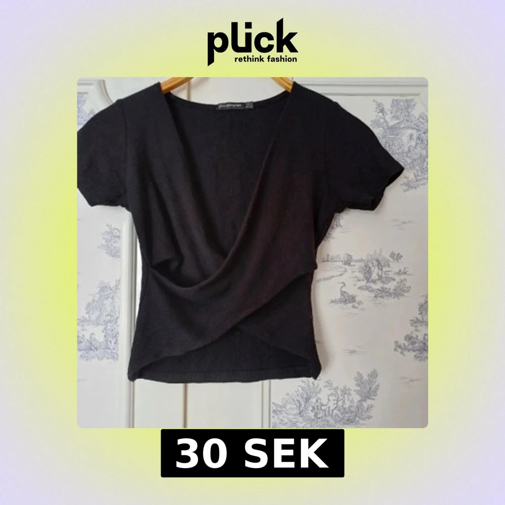 Snygg svart ribbad topp från Stradivarius med omlott-design och korta ärmar. Perfekt för en stilren look. Toppen har en v-ringad hals och är tillverkad i ett mjukt material.