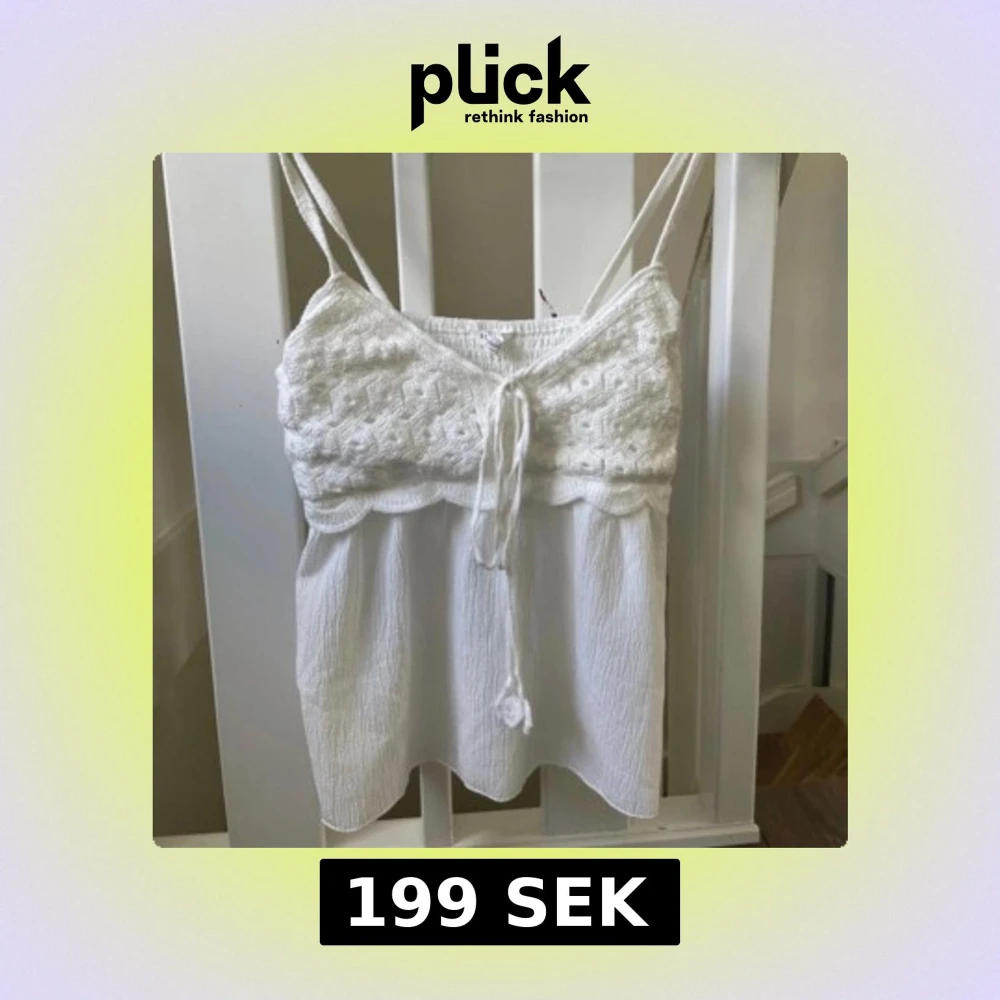 Supersöt vit linnetopp från Stradivarius med virkade detaljer upptill och knyt framtill. Smala axelband och flowy, lätt skrynklig nederdel. Perfekt för varma dagar och ger en boho-vibe. Toppen har elastisk rygg för extra komfort.