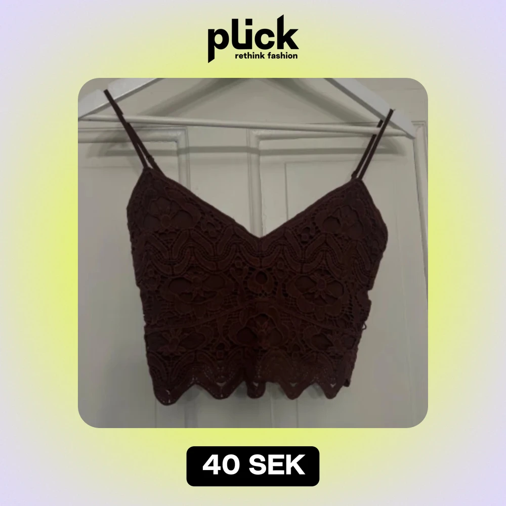 Brunt spetslinne med smala axelband från Stradivarius. Toppen är croppad och har ett spetsmönster. Storlek XS. Nyskick.