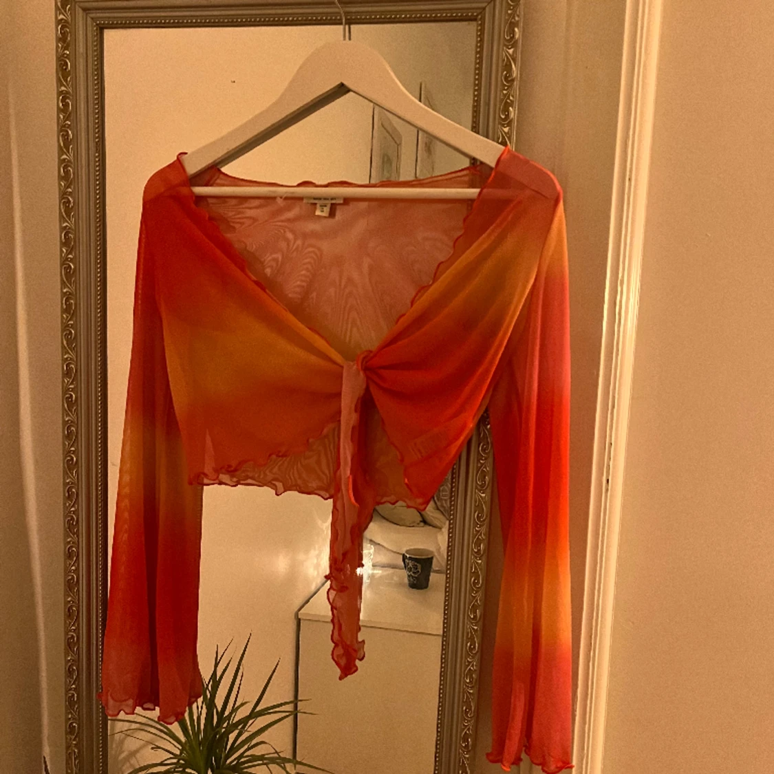 Supersöt rosa/orange topp i mesh med knyte fram. Aldrig använd! Väldigt stretchigt tyg.